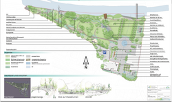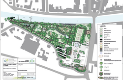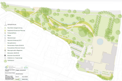 Lennart Schriefer, Max Schroers und Alex Zahn belegten den 3. Platz. Auch sie setzten sich intensiv mit dem Thema Wasser auseinander. Ihre Lösung beinhaltet eine neue Mitte im Park, der Mühlteich mit einem großen Wasserrad rückt deutlich in den Fokus der Betrachtenden. Daneben spielen die Verfasser mit historischen Motiven und lassen den Park eher als abgeschlossenen Innenraum aufleben.