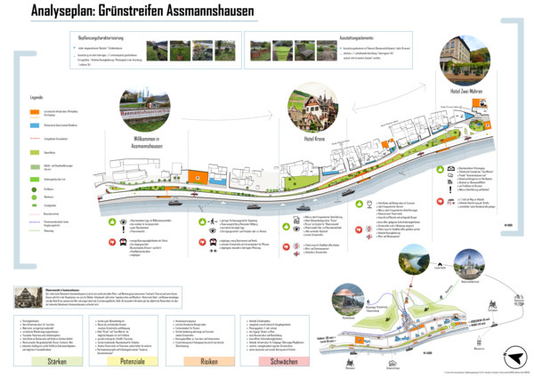 Um ihre Entwürfe erstellen zu können, analysierten die Studierenden zunächst das Planungsgebiet und ermittelten Potenziale. Teil der Aufgabenstellung war zudem die Erarbeitung eines Vegetationskonzeptes und Bepflanzungsplans unter Berücksichtigung des Vegetationsbestandes. Die Studierenden beschäftigten sich auch mit der Frage nach neuen Nutzungsmöglichkeiten und waren gefordert, das Assmannshäuser Flair im Planungsgebiet spürbar zu machen und eine bessere Vernetzung mit der Altstadt zu erreichen. Die verschiedenen Ideen, die auf dieser Basis entstanden, stellen die Vertreterinnen und Vertreter der beteiligten Parteien nun vor die Qual der Wahl: Ein Essbares Assmannshausen steht genauso zur Debatte wie eine Fokussierung auf die heimischen Kräuter, die Treidelstation und Mineralwasserherstellung oder – selbstverständlich – den Wein.