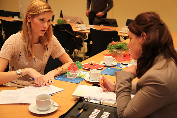 Geisenheimer Studentin der Internationalen Weinwirtschaft (links) im Gespräch mit Susanne Bürkle B.Sc., Assisstentin der Geschäftsführung, Deutscher Weinbauverband