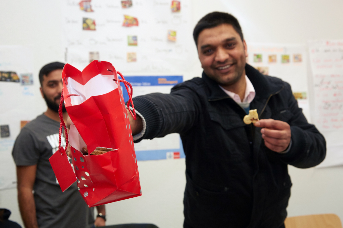 Vom Kurs-Konzept an der Hochschule Geisenheim war Lohner, der als Beauftragter die Spenden für Sprachkurse koordiniert, beeindruckt. „Die Kursteilnehmer sprechen jetzt viel freier als noch vor wenigen Monaten“, lobte er. Die Teilnehmerinnen und Teilnehmer ließen es sich im Gegenzug wiederum nicht nehmen, Lohner persönlich für die Unterstützung zu danken – natürlich auch mit ein paar selbstgebackenen Plätzchen. Sich selbst belohnten die Flüchtlinge, die studentischen Hilfskräfte, die Kursleitung und alle Interessierten beim internationalen Lunch mit einer bunten Mischung aus Falafel, Spundekäs, Reis mit Gemüse und Huhn, Palatschinken, syrischem Gebäck und Lebkuchen. „Wir haben nett geplaudert und die Deutschschüler haben uns im Gegenzug sogar etwas Arabisch beigebracht“, berichtet Paula.