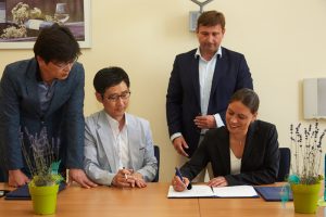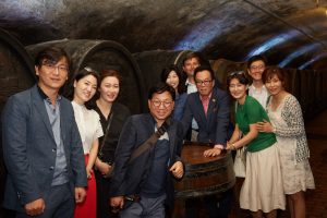 Nach der Unterzeichnung der Kooperationsvereinbarung, mit dem Inhalt des Austauschs von Studium und Lehre zwischen der Catholic University of Pusan und der Hochschule Geisenheim führte Dr. Andrii Tarasov vom Institut für Oenologie die Delegation durch das Weingut. Dabei zeigten die Gäste besonderes Interesse am Sensorikraum, der auf dem neuesten Stand der Technik ist. Ebenso sorgten die handgeschnitzten Holzfässer der ehemaligen Studierenden für Begeisterung.