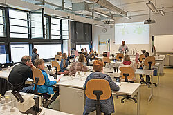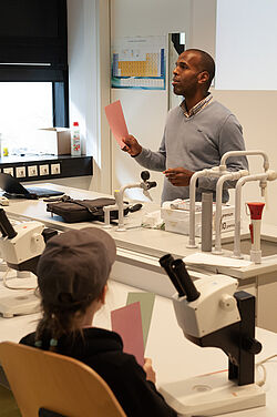 Dr. Moustafa Selim vom Institut für Phytomedizin der Hochschule Geisenheim hat die Kinder mit auf eine Reise in die Welt der Insekten genommen. Erklärt wurde der Unterschied zwischen Insekten und Spinnentieren, der Körperbau eines Insekts wurde begutachtet und Insekten tief in die Facettenaugen geschaut. Immer wieder konnten die Kids mit Abstimmungskärtchen ihr Wissen beweisen und mitmachen. Sie haben nicht nur gelernt, wie die Insekten aussehen, sondern auch warum sie sehr wichtig sind (Bestäubung, Honig, Seide, Futter für andere Tiere), aber auch wo sie schaden können (fressen Pflanzen, übertragen Krankheiten, stechen). Höhepunkt war die „Erforschung“ der Kirschessigfliege „Drosophila suzukii“, deren Weibchen am Po eine Säge haben, mit der sie gesundes Obst verletzen kann, um ihre Eier dort hinein zu legen. Ein echtes Problem für Obstbauern. Das Insekt ist eine invasive Art. Das Insekt konnte unter dem Binokular (Mikroskop mit zwei Okularen) angeschaut werden. Dann wurde fleißig gezeichnet und weil es immer ein wenig Schwung hineinbringt, wurde der Wettbewerb eröffnet. Die Preise für die drei Siegerbilder: für drei der Wissenschaftler:innen gibt es je ein Insektenhotel aus dem Nabu Sortiment. Die gemalten Bilder der Gewinner:innen finden Sie im Anhang.