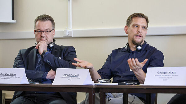 An der Veranstaltung nahmen von der Hochschule Geisenheim University Jenny Eckes (Institut für Landschaftsplanung und Naturschutz) und Dr. Jörn Schultheiß (Kompetenzzentrum Kulturlandschaft) teil. Sie stellten am Beispiel des DBU-geförderten Projekts „Schwammregion Soonwald-Nahe“ vor, wie akteursübergreifende Netzwerke zur Förderung des flächendeckenden Wasserrückhalts im Hunsrück aufgebaut werden. Außerdem beteiligten sie sich an zwei intensiven Podiumsdiskussionen zu den Themen „Wasserversorgung bei Dürre“ sowie „Territoriale Hochwasserprävention, -management und –anpassung“.
