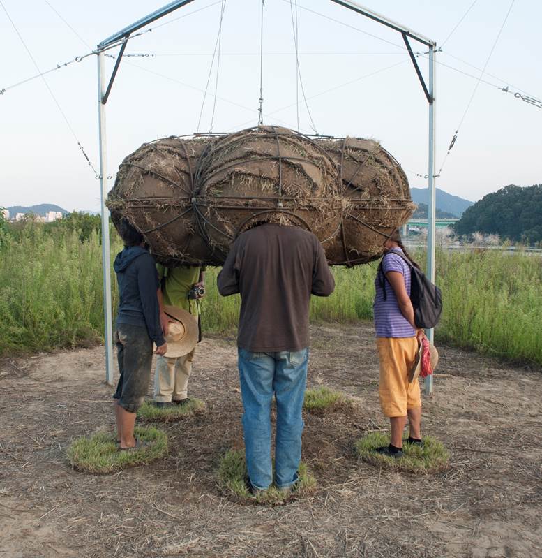 Ein hängender Garten für maximal fünf Personen, ein geschlossener Garten, »hortus conclusus«, der nur mit dem Kopf besucht werden kann. Während die Aussenseite des Objekts zu Beginn nur aus Erde besteht, wächst im Inneren Gras. Maximal fünf Personen können über Öffnungen ihre Köpfe hinein stecken, um darin über Gras zu sprechen.