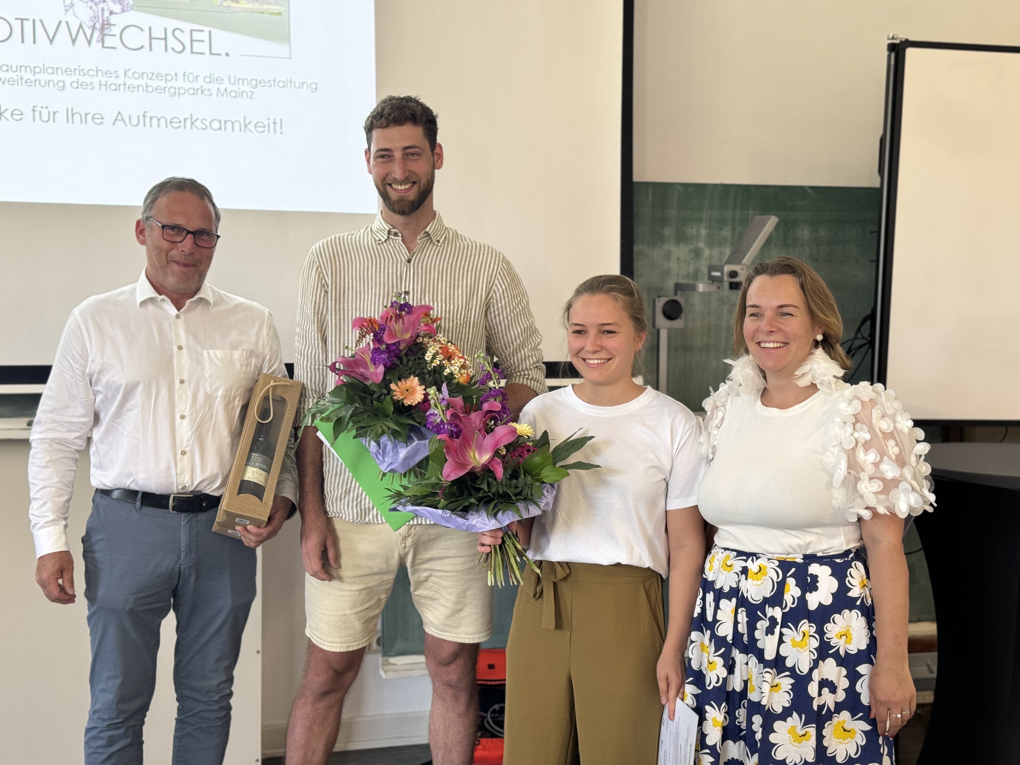 Der Studienpreis Landschaftsarchitektur wird einmal im Jahr für hervorragende Abschlussarbeiten vergeben und ist mit insgesamt 1.000 Euro dotiert. Gestiftet wird der Preis von der Deutschen Gesellschaft für Gartenkunst und Landschaftskultur e. V. (DGGL), dem Bund Deutscher Landschaftsarchitekten (bdla), dem Landesverband Hessen e. V. (bdla), dem Fachverband Garten-, Landschafts- und Sportplatzbau Hessen-Thüringen e. V. (FGL) und der Hessischen Vereinigung für Naturschutz und Landschaftspflege e. V. (HVNL). Als Vertreter der Sponsor:innen war Alexander Tilburgs vom FGL anwesend und beglückwünschte die Preisträger:innen.
