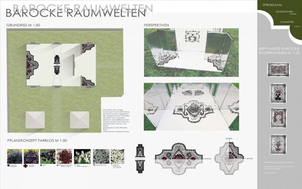 Ihre Raumwelten dürfen die Siegerinnen im Frühjahr für die Besucherinnen und Besucher des Gartenfestes im Schlosspark aufbauen: Mit hohen Wänden schaffen die beiden Studentinnen dort einen Raum im Garten. Von außen ist dieser mit barocken Tapeten angelegt und mit bepflanzten Bilderrahmen bestückt. Innen sind die Wände verspiegelt. „Bei einer Aufzugfahrt kam uns der Gedanke an den Spiegelsaal von Versailles – die Idee zum Wettbewerbsmotto ‚Zimmer im Garten‘ war geboren“, erzählt Julie Ann Holmok. „Mit den Spiegeln schaffen wir mehrere Dimensionen und endlose Räume“, ergänzt ihre Kommilitonin Aylin Kreß. Die innenliegenden Beete in barocken Formen ergeben nur dank der Spiegel ein Ganzes.