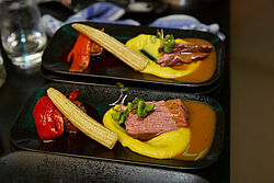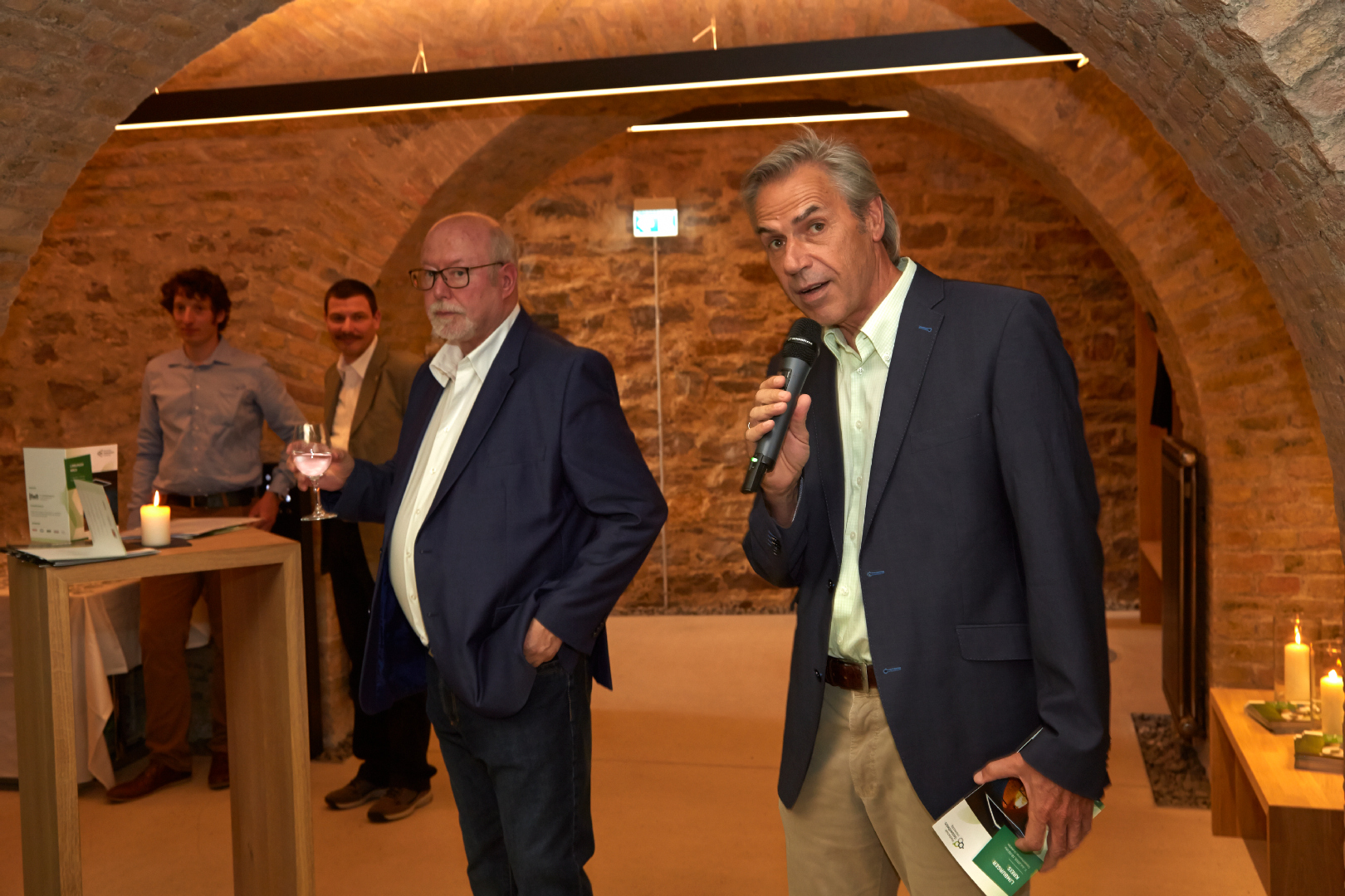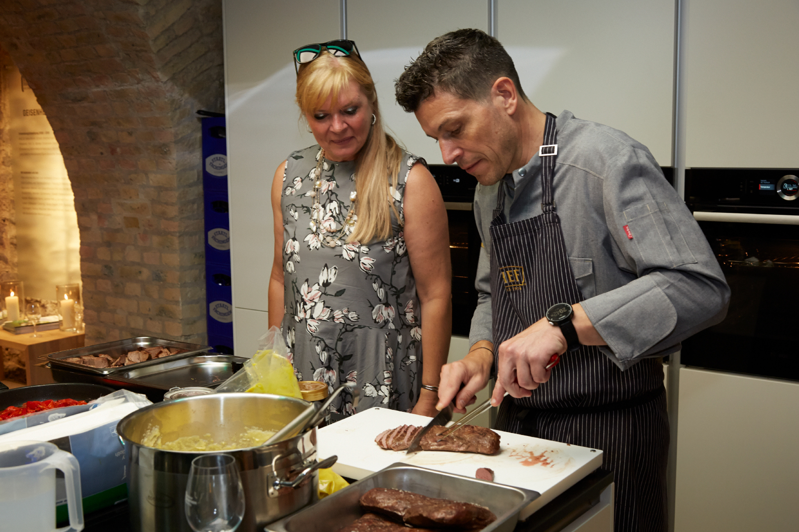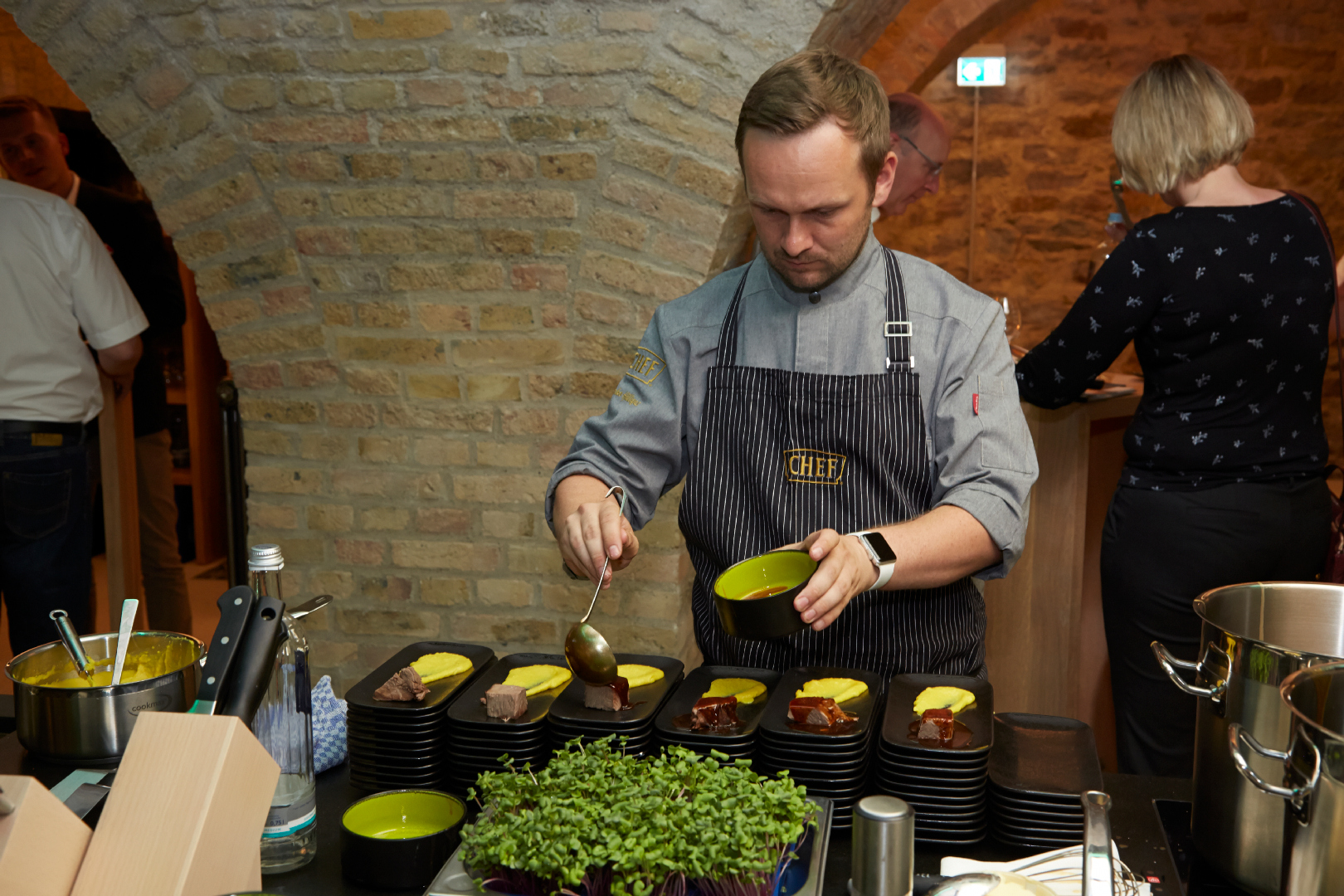 Als Überaschungsgast angekündigt war Kochlegende Harald Wohlfarth, der mit seiner Frau anreiste. Im Geisenheimer Unikeller (www.uni-keller.de) hatten an diesem Abend jedoch andere die kulinarische Verantwortung. Die Küchenmeister Janko Hilliges und Carsten Essen (CHEF2CHEF Manager) zauberten gemeinsam mit den Gästen ein köstliches Viergangmenü.