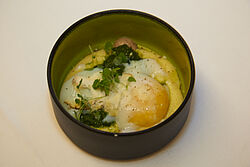 - Zwerghuhn-Onsen-Ei l Rahmpolenta l junger Spinat l fermentierte Knoblauch-Mayo l Belper Knolle