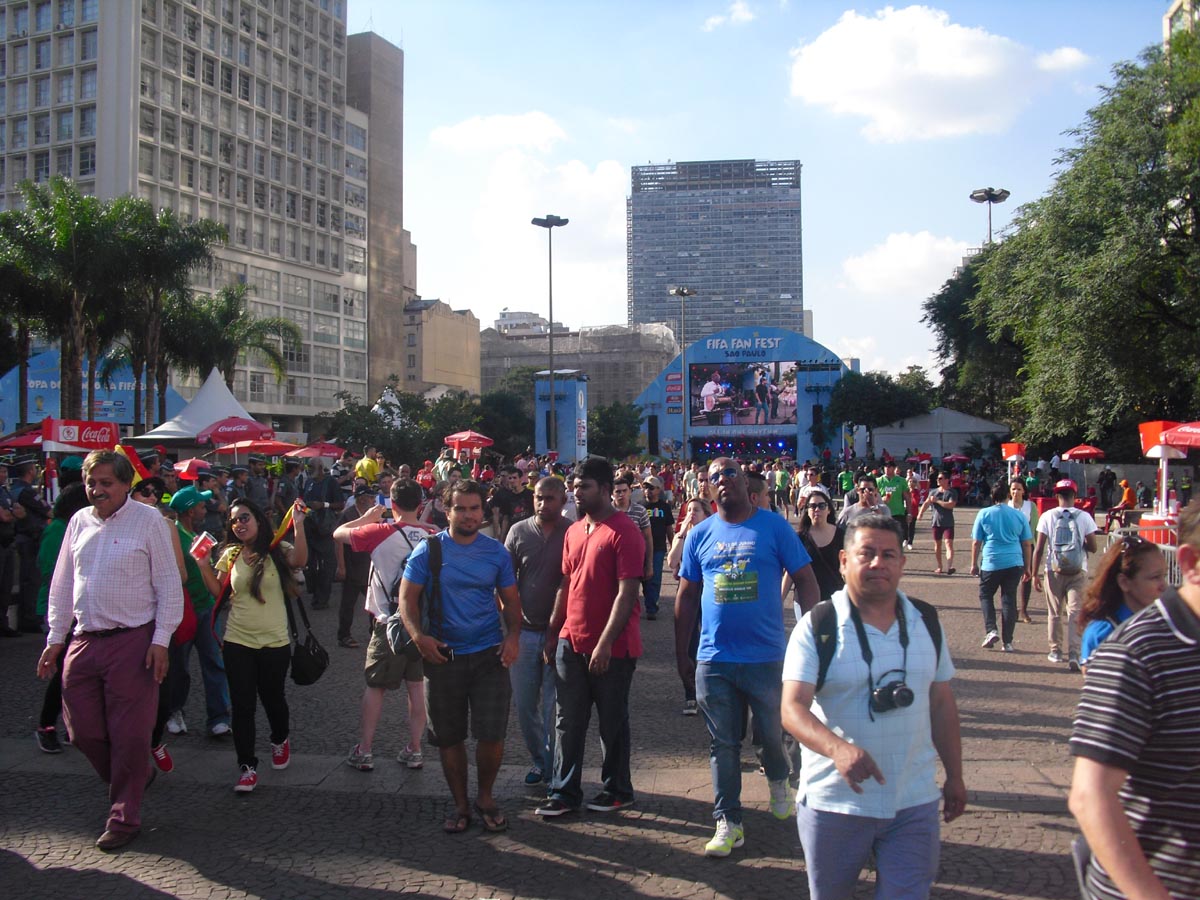 Mit einem Tag Verspätung nun ein paar Eindrücke von der Fanmeile aus Sao Paulo. Diesmal war es nicht so voll wie beim Eröffnungsspiel, wo tausende Leute nicht mehr hineingelassen wurden. Das lag unter anderem an der Uhrzeit, das Spiel begann schon um 13 Uhr brasilianischer Zeit, dann an der Tatsache, dass die Regierung nur für Spiele mit brasilianischer Beteiligung einen offiziellen Feiertag aussprechen kann und vor allem daran, dass eben nur Deutschland und nicht Brasilien selbst gespielt hat.