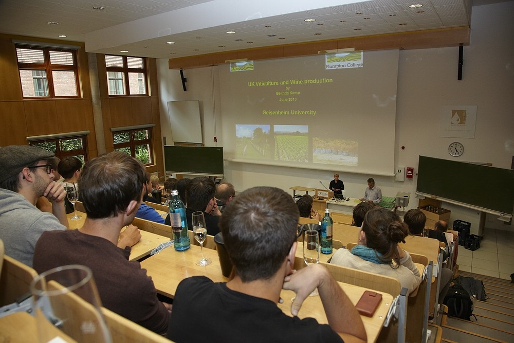 Einen Überblick über Weinbau in England verschaffte Belinda Kemp vom Plumpton College den Geisenheimer Studierenden im Gerd-Erbslöh-Saal. Mit im Gepäck Sparkling wine zum Verkosten. Den Champagner-Charakter erklärte die Önologin mit der Ähnlichkeit der Böden in Südengland und der Champagne. Die mehr als 600 Weingüter in England haben sich überwiegend sieben Hauptrebsorten verschrieben, wovon Bacchus „really popular“ sei.