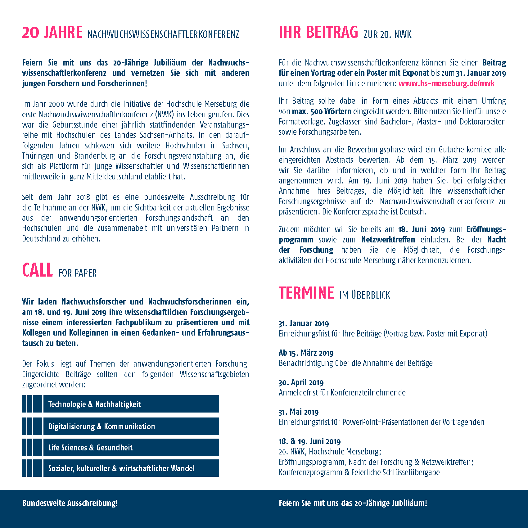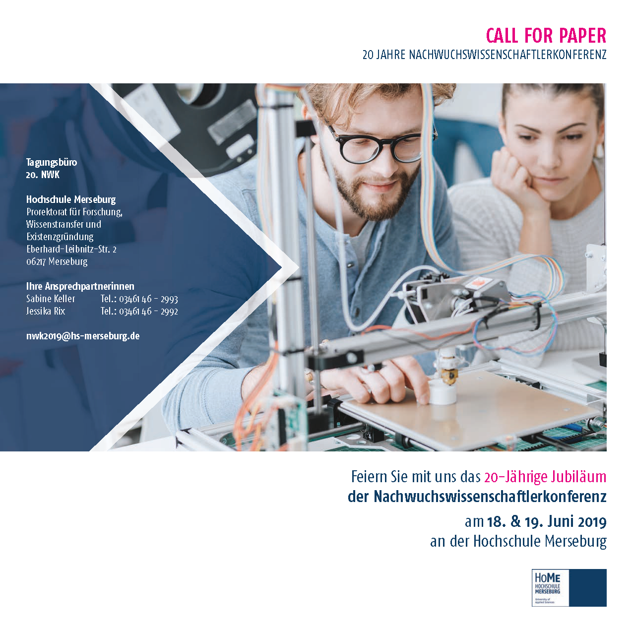 Am 18. und 19. Juni 2019 lädt die Hochschule Merseburg Nachwuchsforscherinnen und -forscher ein, auf der 20. Nachwuchswissenschaftlerkonferenz ihre Forschungsergebnisse einem interessierten Fachpublikum in Form von Vorträgen und Postern zu präsentieren und in einen wissenschaftlichen Gedanken- und Erfahrungsaustausch zu treten.