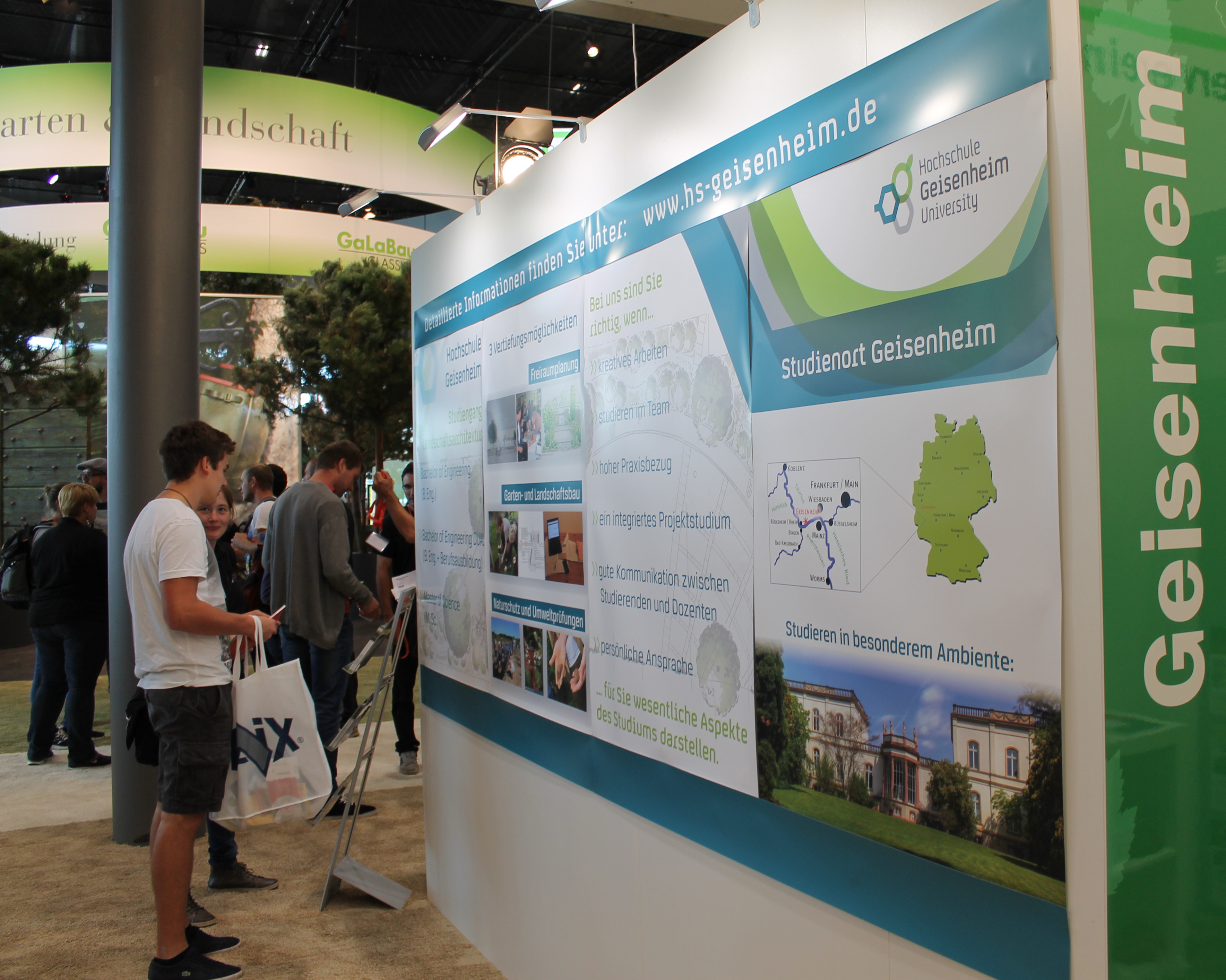 Die neu gebaute Messehalle 3a bot nicht nur Platz für den Gärtnertreff der Fachverbände, sondern auch für den Gemeinschaftsstand der Hochschulen in Deutschland. Hier präsentierte sich die Hochschule Geisenheim mit dem Studiengang Landschaftsarchitektur „herausragend anders“, so die einhellige Meinung vieler Besucher. „Die eigens für die GaLaBau erstellten Messeplakate sowie Imagebroschüren und Informationsflyer kamen bei den Studieninteressenten sehr gut an. Was uns immer besonders freut, ist der Umstand, dass sich neben Interessenten und Studierenden auch immer viele Ehemalige auf dem Stand zeigen und nach der Entwicklung ihrer Alma Mater sehen“, so Prof. Gerd Helget und sein Beratungsteam.