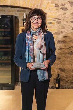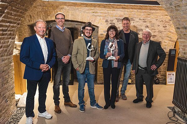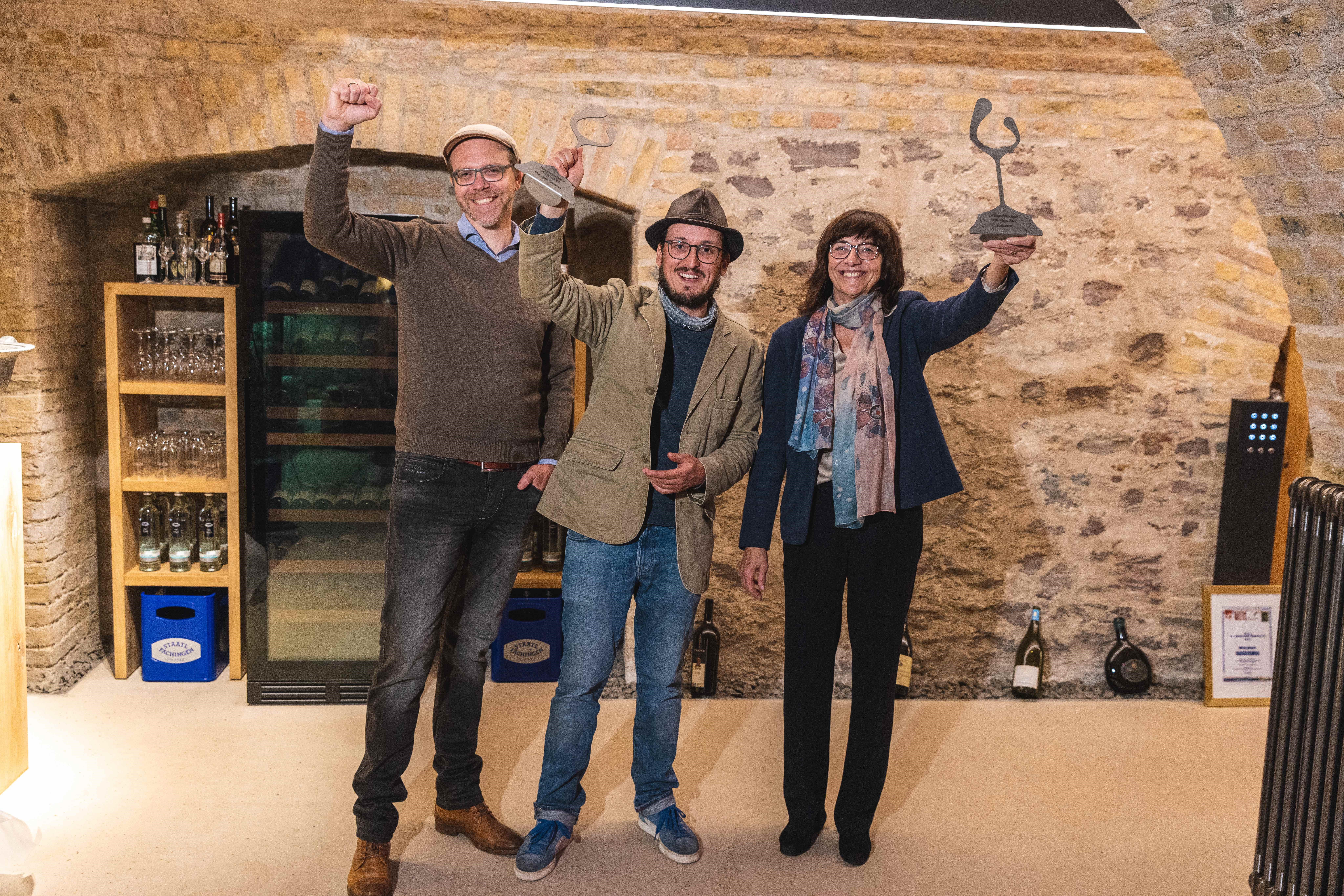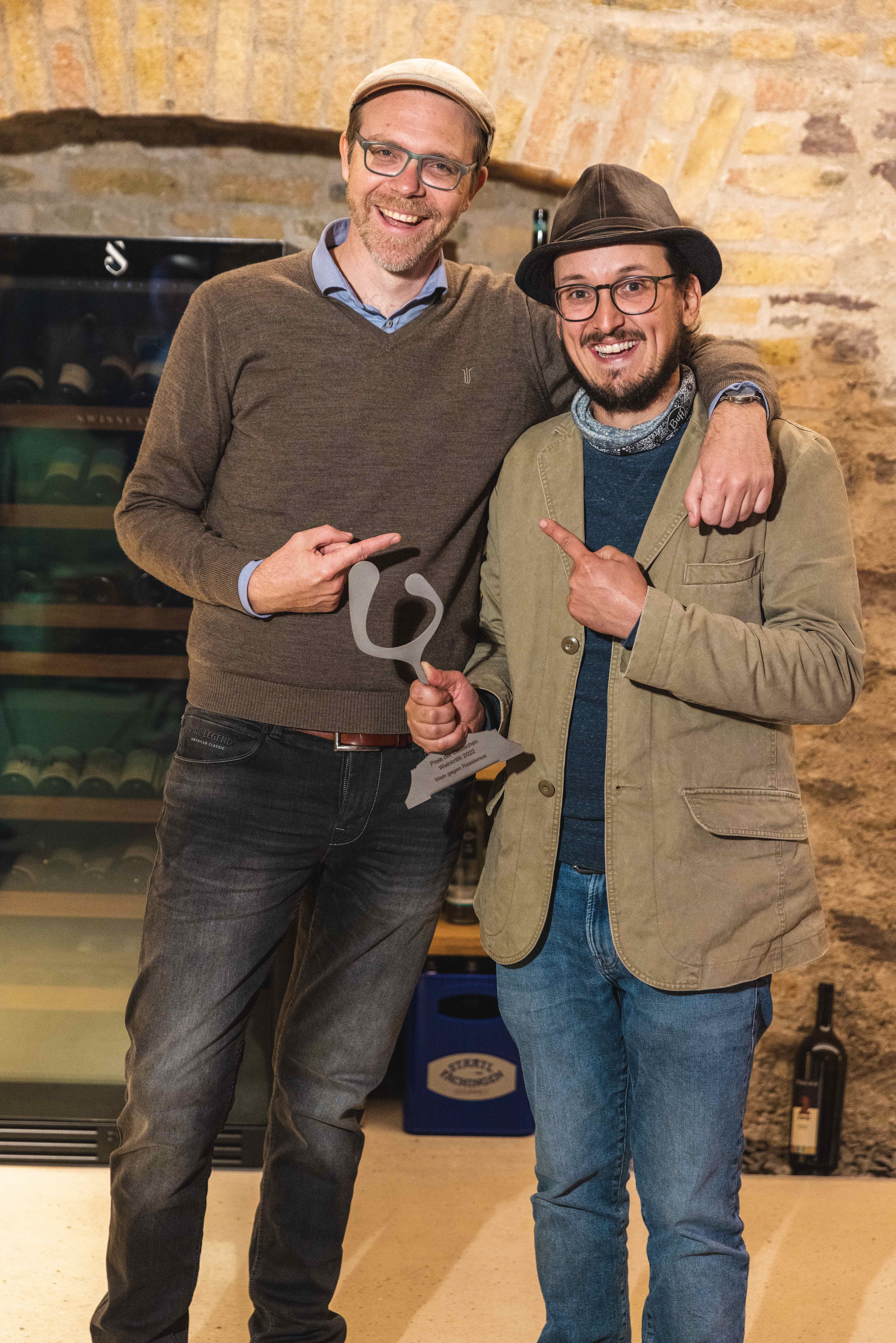 In dem stimmungsvollen Keller der Hochschule Geisenheim begrüßte Wolfgang Junglas, Vorsitzender von Weinfeder e.V., die Gäste und Preisträger zur Verleihung des renommierten „Preis der Deutschen Weinkritik“. Erstmalig wurde die Veranstaltung auf YouTube und Facebook live gestreamt. Alljährlich vergeben die Mitglieder des Weinjournalistenvereins den Preis an Projekte und Personen, die sich besondere Verdienste um den Weinbau erworben haben, aber auch Projekte, die den Gemeinschaftsgeist fördern. Dies trifft im besonderen Maße auf den Preisträger WEIN GEGEN RASSISMUS zu. Die Idee dazu hatte Winzer Lukas Krauß aus Lambsheim in der Pfalz schon 2015. Auch dank der Zusammenarbeit mit der Bad Dürkheimer Agentur „Medienagenten“ und der Hochschule Geisenheim hat sich das Projekt sehr dynamisch entwickelt: Die Zahl der Unterstützenden aus der Weinbranche wächst kontinuierlich. Die gesammelten Spendengelder sollen „den Helfern in der aktuellen Flüchtlingstragödie die Arbeit erleichtern“ – so beschreibt die Initiative ihr Ziel. „Es sind schon über 50.000 € zusammengekommen.“ freut sich Lukas Krauß, der Winzer mit dem Hut. Gemeinsam mit Jochen Stange von den Medienagenten nahm er die Auszeichnung entgegen. Robert Lönarz von der Hochschule Geisenheim würdigte in seiner Laudatio ausführlich das Projekt.