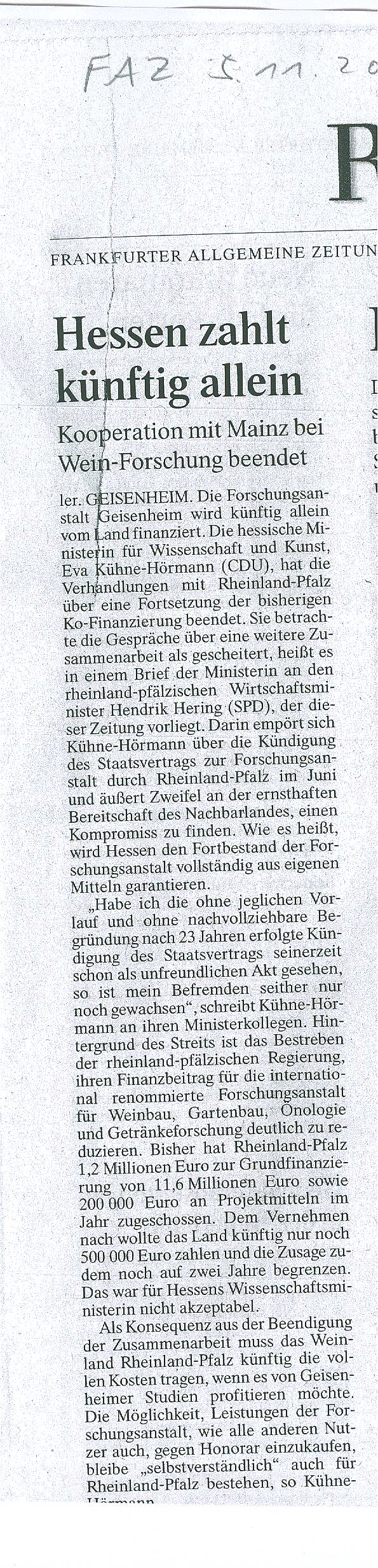 Hessen beendet Kooperation mit Mainz in Geisenheim (dpa/lhe) – Die Weinbau-Forschungsanstalt in Geisenheim wird vom kommenden Jahr an nur vom Land Hessen finanziert. Das Land Rheinland-Pfalz hatte eine seit 1987 bestehende Ko-Finanzierung im Juni gekündigt. Dies werde zum Jahresende wirksam, sagte ein Sprecher des Ministeriums am Freitag. Die «Frankfurter Allgemeine Zeitung» (Freitagsausgabe) hatte berichtet, Wissenschaftsministerin Eva Kühne- Hörmann (CDU) sehe Gespräche als gescheitert an. Rheinland-Pfalz hatte bislang 1,2 Millionen Euro zum Gesamtbudget von 11,6 Millionen Euro der renommierten Rheingauer Forschungsanstalt für Weinbau und Önologie gezahlt.