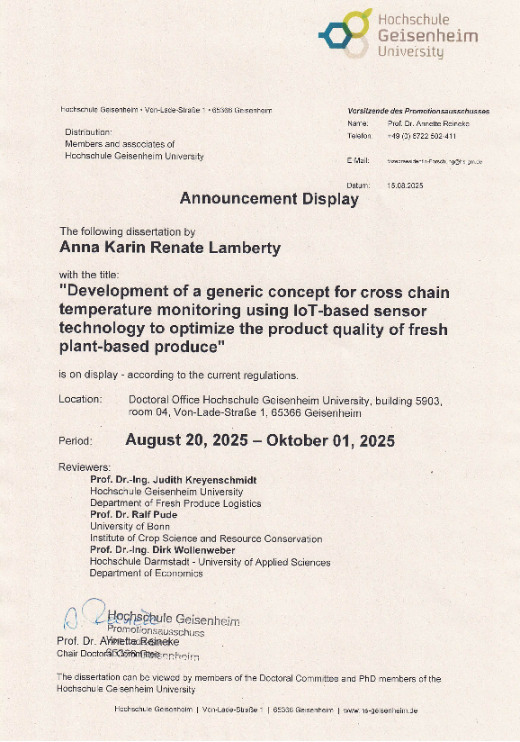 "Development of a generic concept for cross chain temperature monitoring using loT-based sensor technology to optimize the product quality of fresh plant-based produce"
