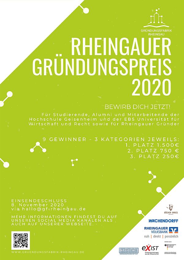 Mit dem Rheingauer Gründungspreis startet die Gründungsfabrik Rheingau in Zusammenarbeit mit der Rheingauer Volksbank und den drei regionalen Partnern Bäcker Dries, KISICO & Wachendorff ein weiteres Angebot: den „Rheingauer Gründungspreis 2020“. Damit wird das Ziel verfolgt, nachhaltige, originelle und zukunftsfähige Gründungsideen der Region zu unterstützen.