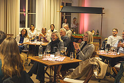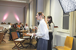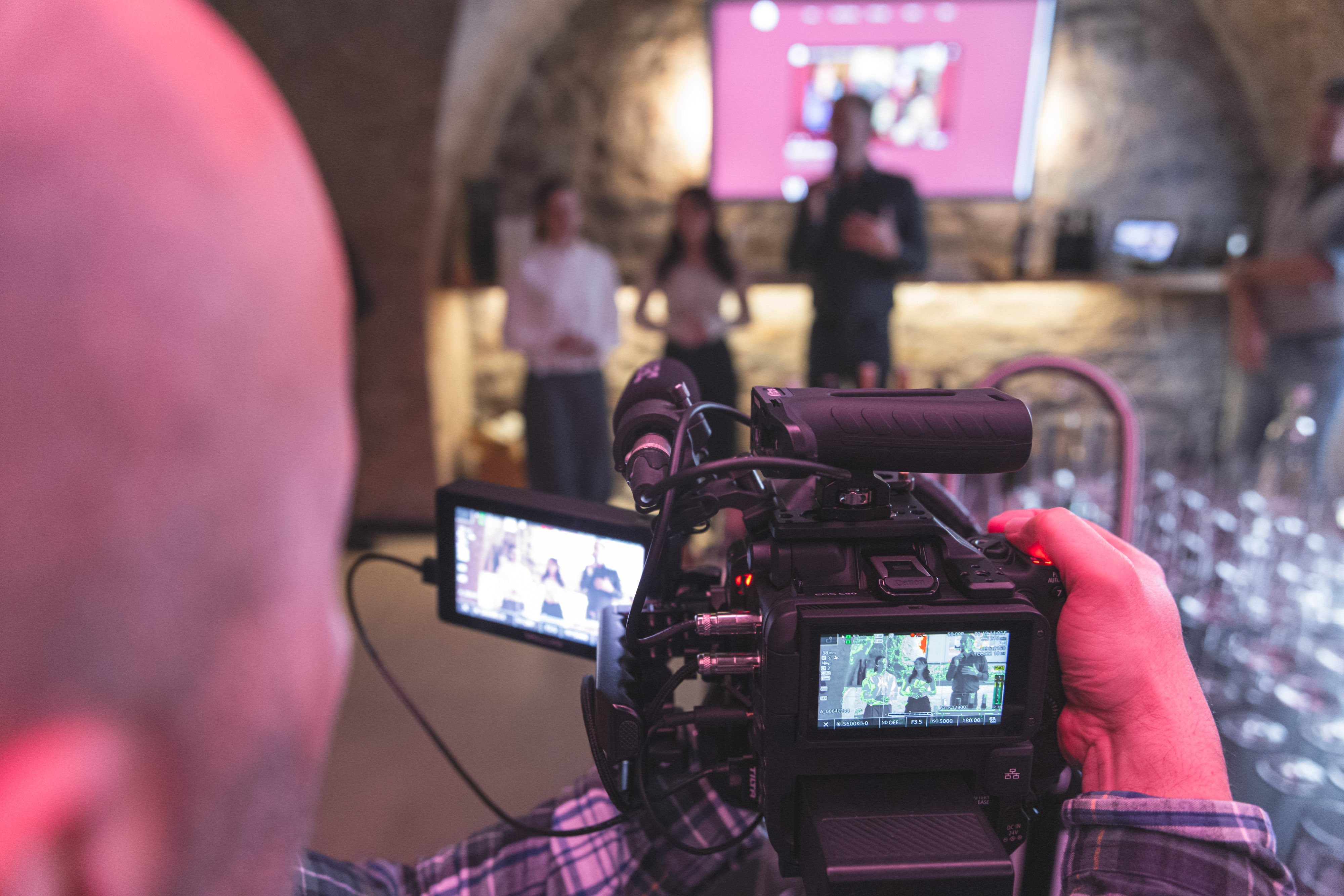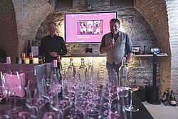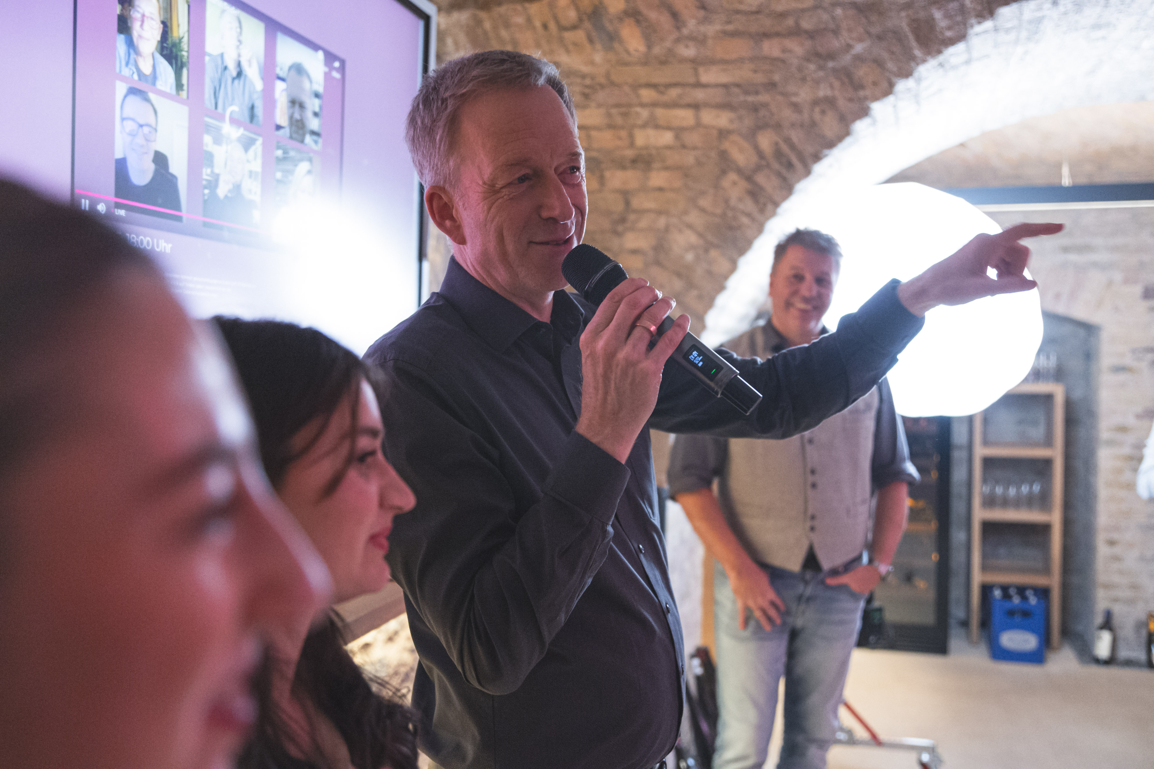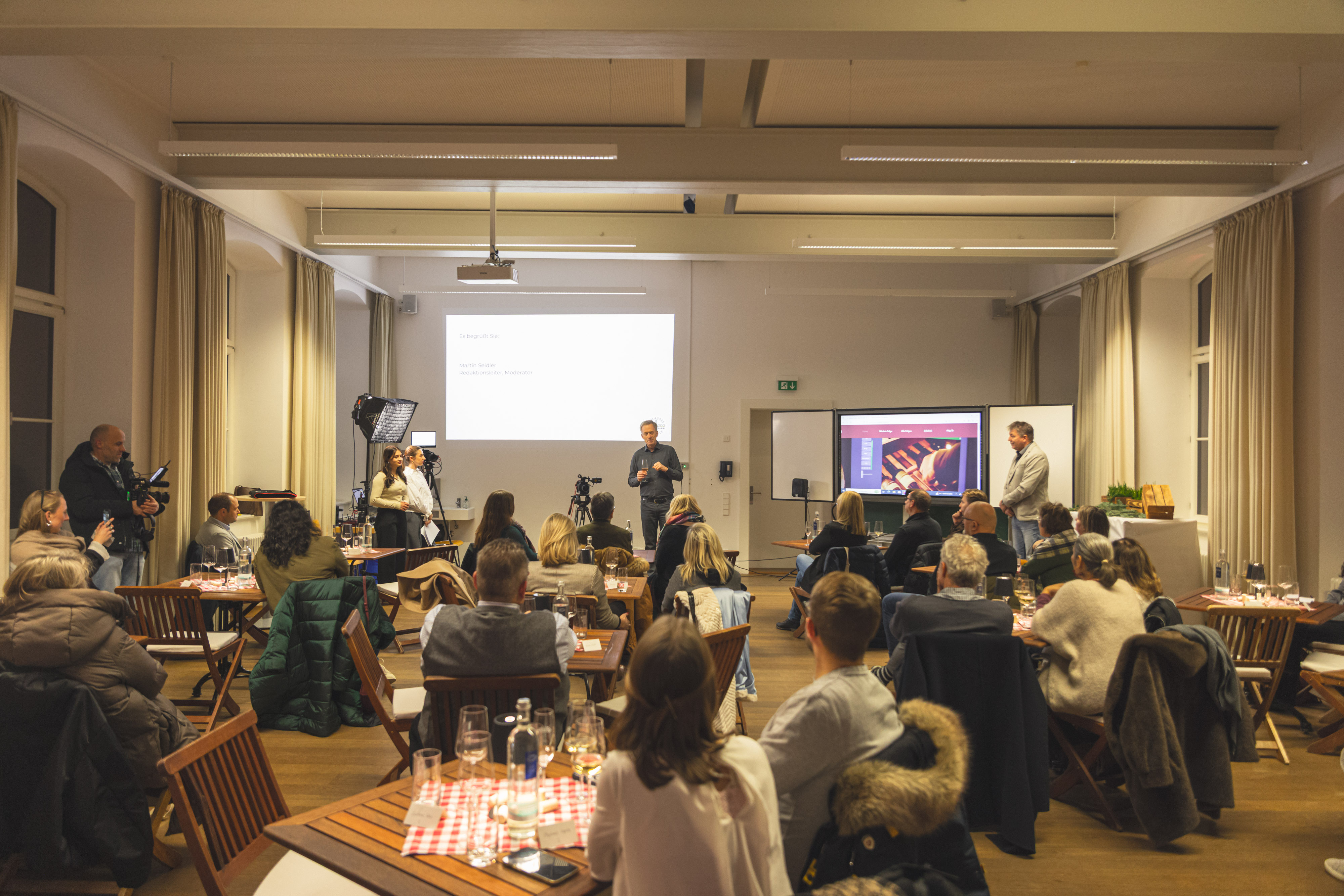 Für ein besonderes optisches Highlight sorgte das Rheingauer Startup CMPlus Events der Gründer Colin Frambach und Max Schubert. Sie verwandelten den Hörsaal der Hochschule Geisenheim in ein authentisches Heurigen-Ambiente – mit warmem Licht, Holzdetails und Wiener Atmosphäre. Die 35 Backstage-Gäste reagierten begeistert auf das stimmige Zusammenspiel von Design, Genuss und Weinvermittlung.
