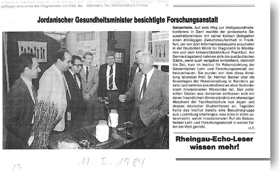 Oben ersehen Sie ein erstes Bespiel aus 1984 – Prof. Dr. Helmut Becker begrüßte den jordanischen Gesundheitsmininster in der Rebenzüchtung.