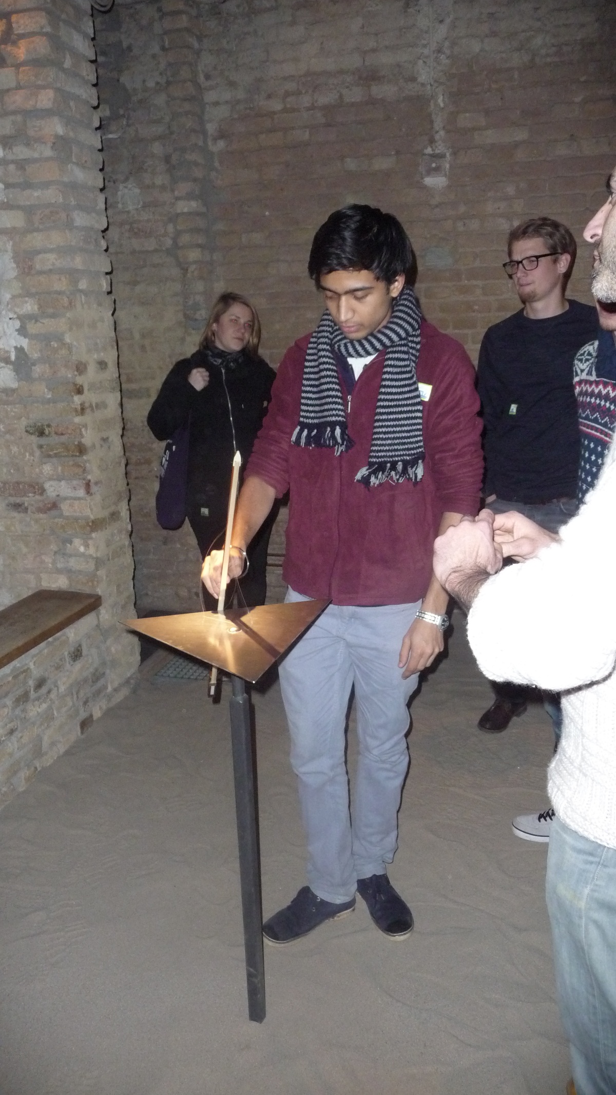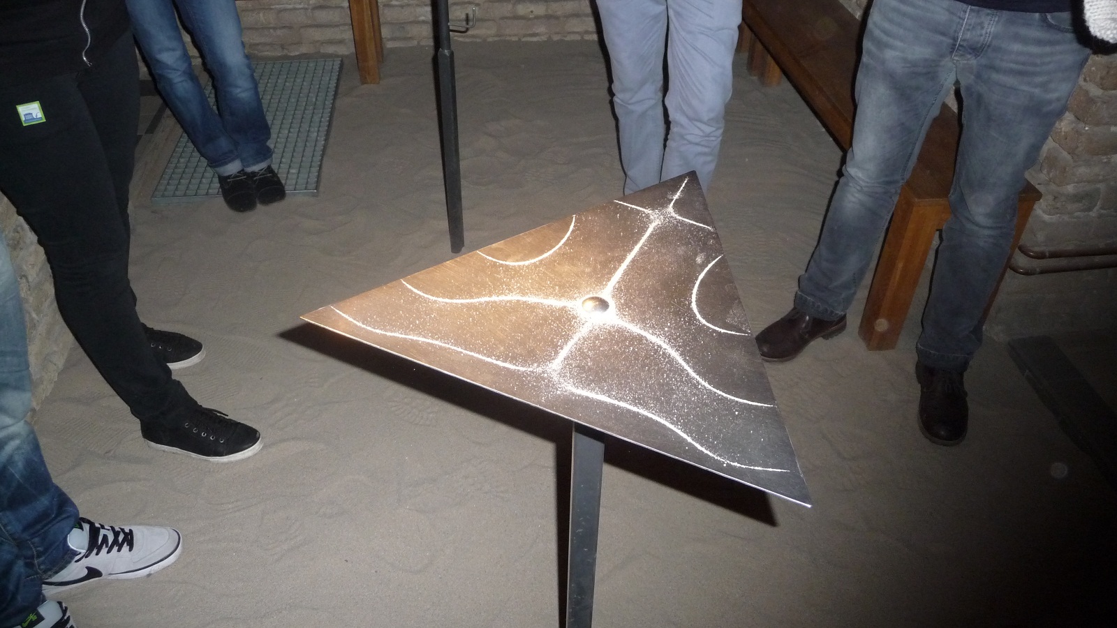 Weitere Stationen im Schloss beschäftigten sich mit Klang, Farben und deren Zusammensetzung nach der Goetheschen Farbenlehre, Gleichgewichtssinn und Gruppendynamik und schließlich mit Klang und Geräuschen, die ja im Endeffekt nur aus Bewegung bestehen und welche man sichtbar machen kann. In einem interessannten Experiment mit einem Geigenbogen, einer Metallplatte und Sand wurden aus zufällig angeordneten Sandkörnern symmetrische Figuren, einzig allein durch eine mit dem Geigenbogen erzeugte Schwingung.