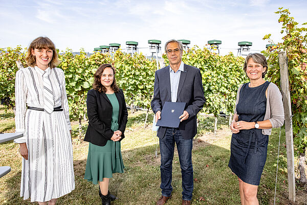 v.l.n.r.: Dr. Maria Schulze-Sylvester, Staatssekretärin Ayse Asar, Hochschulpräsident Prof. Dr. Hans Reiner Schultz, Vizepräsidentin für Forschung der Hochschule Geisenheim Prof. Dr. Annette Reineke; Bildquelle: WOODWORKS