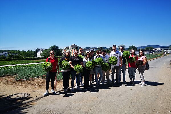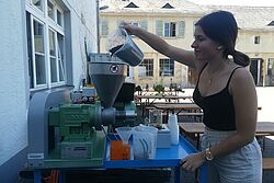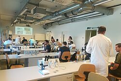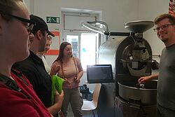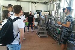 Zum Abschluss des Studienorientierungsangebotes lud die Hochschule Geisenheim rund 40 Schülerinnen und Schüler der Peter-Behrens-Schule aus Darmstadt ein. Sie befinden sich in der Ausbildung zur Fachkraft für Lebensmitteltechnik und konnten vor Ort den Campus und das Studienangebot der Hochschule Geisenheim entdecken. An die allgemeine Vorstellung der Hochschule durch die zentrale Studienberatung schlossen sich Campusführungen an. Im Zentralen Instituts- und Laborgebäude tauchten die Schülerinnen und Schüler in die Welt der Mikroorganismen ein: Sie mikroskopierten Hefen und Bakterien aus Lebensmitteln und machten Keime auf Agarplatten sichtbar. Nach einer Mittagspause im Hof des Getränketechnologischen Zentrums stellten die Dozierenden den praxisorientierten Bachelor-Studiengang Lebensmittelsicherheit vor. Danach erlebten die Gäste, was praxisnah in der Praxis heißt: Sie konnten an Stationen wie „Pflanzliche Öle pressen“, „Bier brauen“, „Kaffee rösten“ und „Schokolade conchieren“ die Vielfalt des Studiengangs erleben.