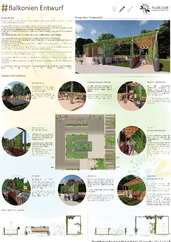 #Balkonien – dahinter verbirgt sich ein sehr nutzerbezogener Themengarten der drittplatzierten Studierenden Anna Schlimpen und Joshua Fehr. Er befasst sich mit der Frage, was jeder persönlich auch auf kleinem Rahmen machen kann, um ein Bauwerk zu begrünen. Die Summe der kleinen Maßnahmen im privaten Raum ergibt wieder ein Ganzes, das in der Summe einen Beitrag zur urbanen Begrünung und somit zur Klimaanpassung darstellt.