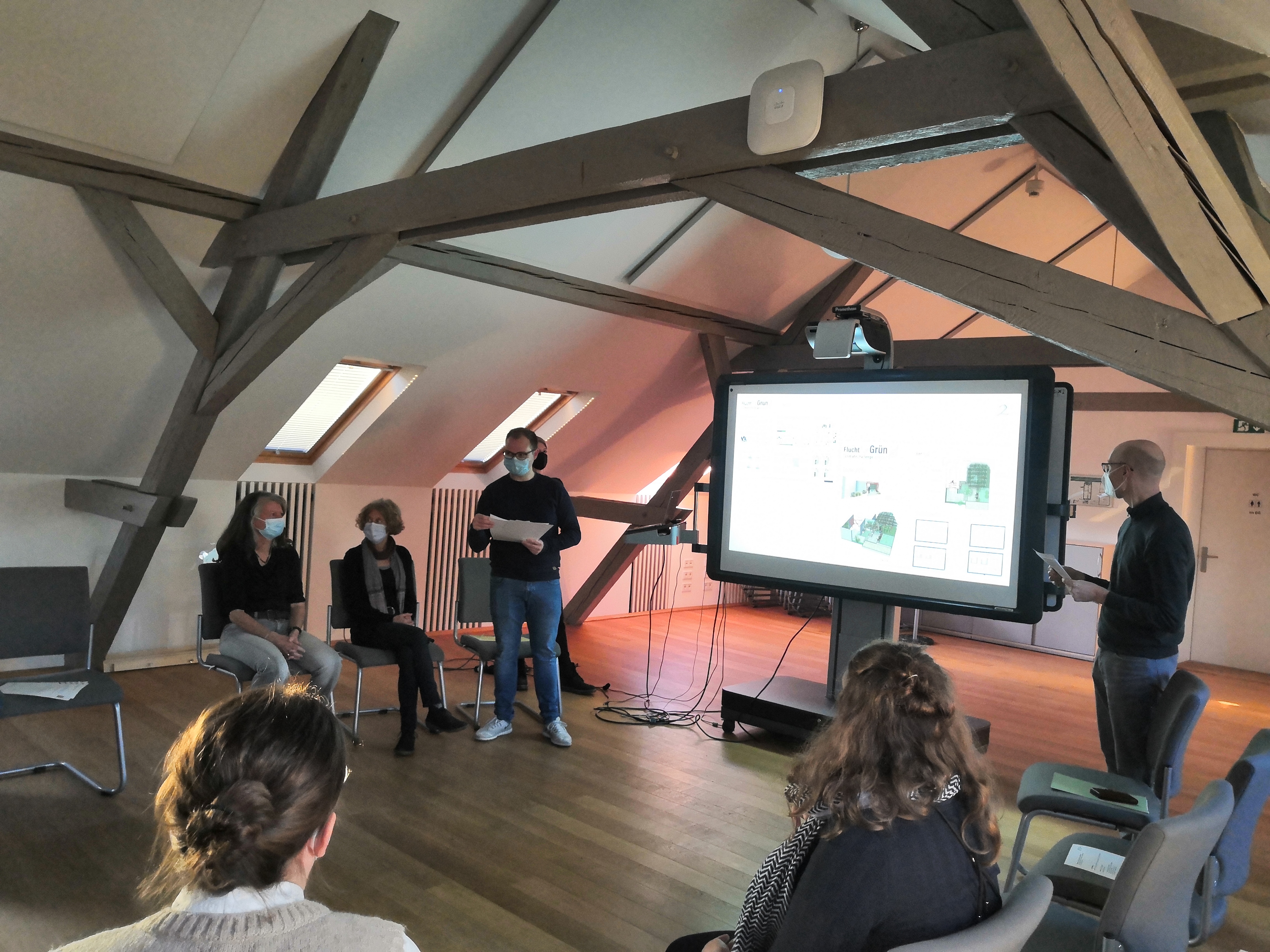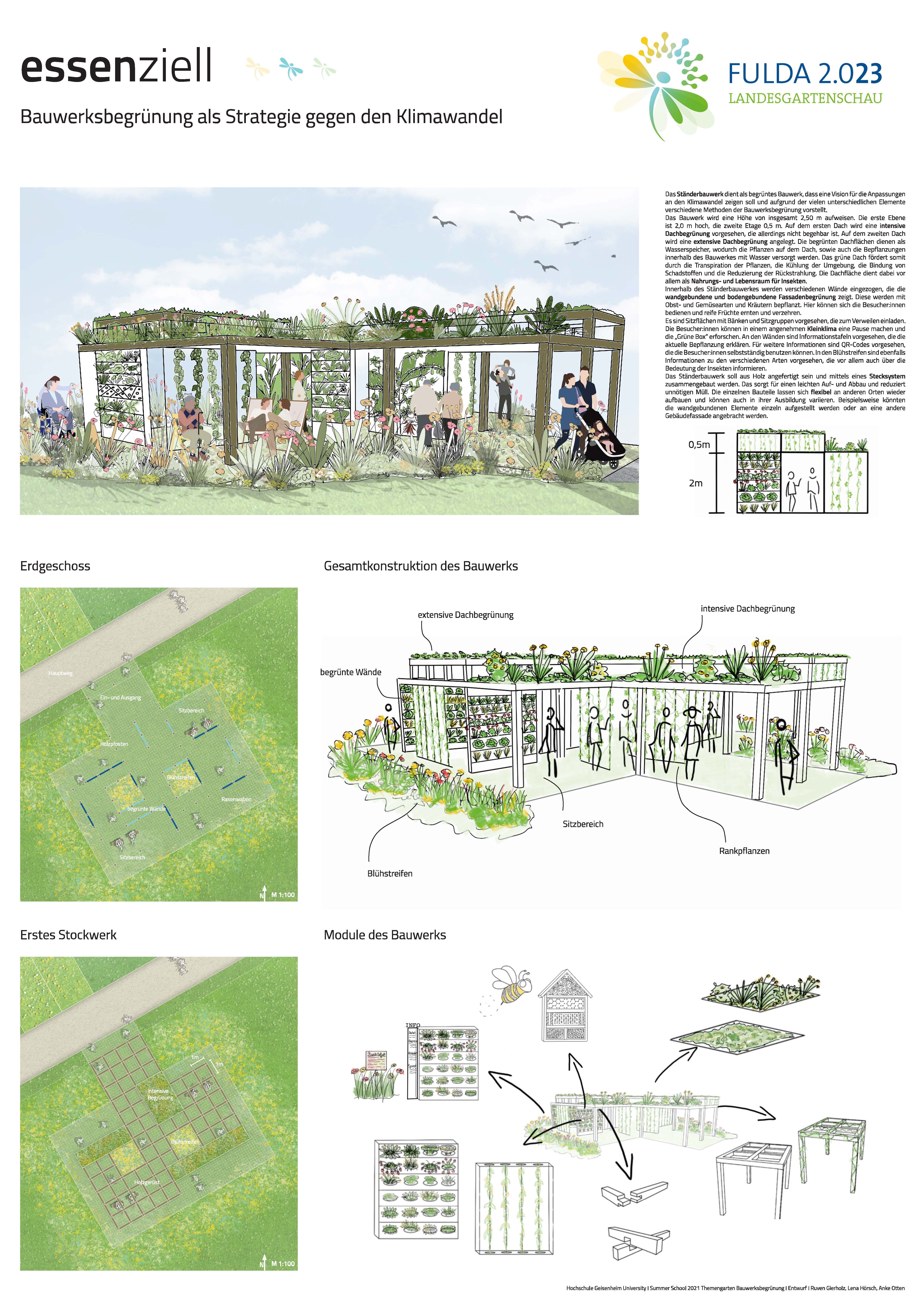 Zu diesen Themen entwickelten Studierende aus den Bereichen Landschaftsarchitektur und Gartenbau, in einer interdisziplinären Summer School, Ideen für einen Schaugarten. Dabei wurden sie fachlich unterstützt durch die Dozentinnen Stephanie Braun-Fischer und Maren Stollberg aus dem Institut für urbanen Gartenbau und Pflanzenverwendung. Anfang August dieses Jahres startete der einwöchige Workshop im Online Format mit 15 Studierenden. In Arbeitsgruppen beschäftigten sie sich sowohl mit den freiraumplanerischen als auch mit den klimarelevanten Aspekten, die durch Gebäudebegrünung erreicht werden können. Auf dieser Grundlage wurden sehr unterschiedliche und innovative Konzepte erarbeitet, welche sich im Anschluss an die Summer School dem Urteil der Jury unterziehen mussten.
