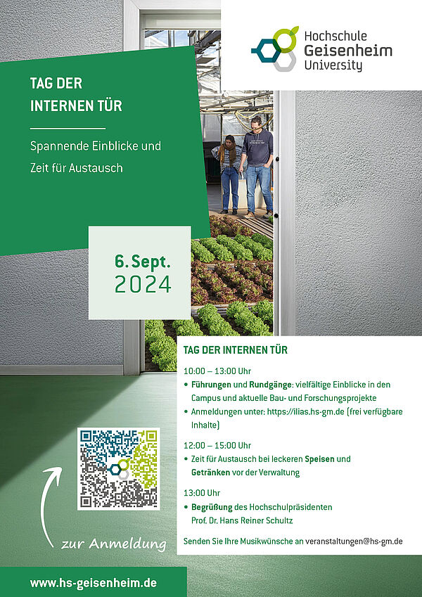 Am 6. September lädt das Präsidium Sie herzlich zu einem TAG DER INTERNEN TÜR an der Hochschule Geisenheim ein. Informieren Sie sich über die aktuellen Bautätigkeiten oder erkunden Sie unseren Campus. Es erwarten Sie spannende Einblicke in unsere Institute und aktuelle Forschungsprojekte. Im Anschluss haben Sie die Möglichkeit zu einem gemütlichen Beisammensein vor der Verwaltung mit leckeren Speisen und Getränke.