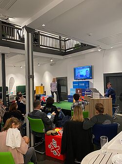 Auch in diesem Jahr hatten die Jurymitglieder aus Wissenschaft und regionalen Sponsoren die Vorauswahl getroffen und insgesamt neun Gründungsideen aus den drei ausgeschriebenen Kategorien bestimmt. Alle Finalistinnen und Finalisten hatten dann am Abend des 17. November die Gelegenheit ihre Geschäftsideen auf der Pitch-Bühne in der Gründungsfabrik Rheingau live vorzustellen. Nach einem Grußwort durch den Vorstand des Fördervereins der Gründungsfabrik – Andreas Zeiselmaier und Bürgermeister Christian Aßmann – ging es direkt in die Pitches. Alle Zuschauenden konnten per Online-Voting über ihre Favoriten abstimmen, was die Veranstaltung interaktiv und kurzweilig gestaltete.