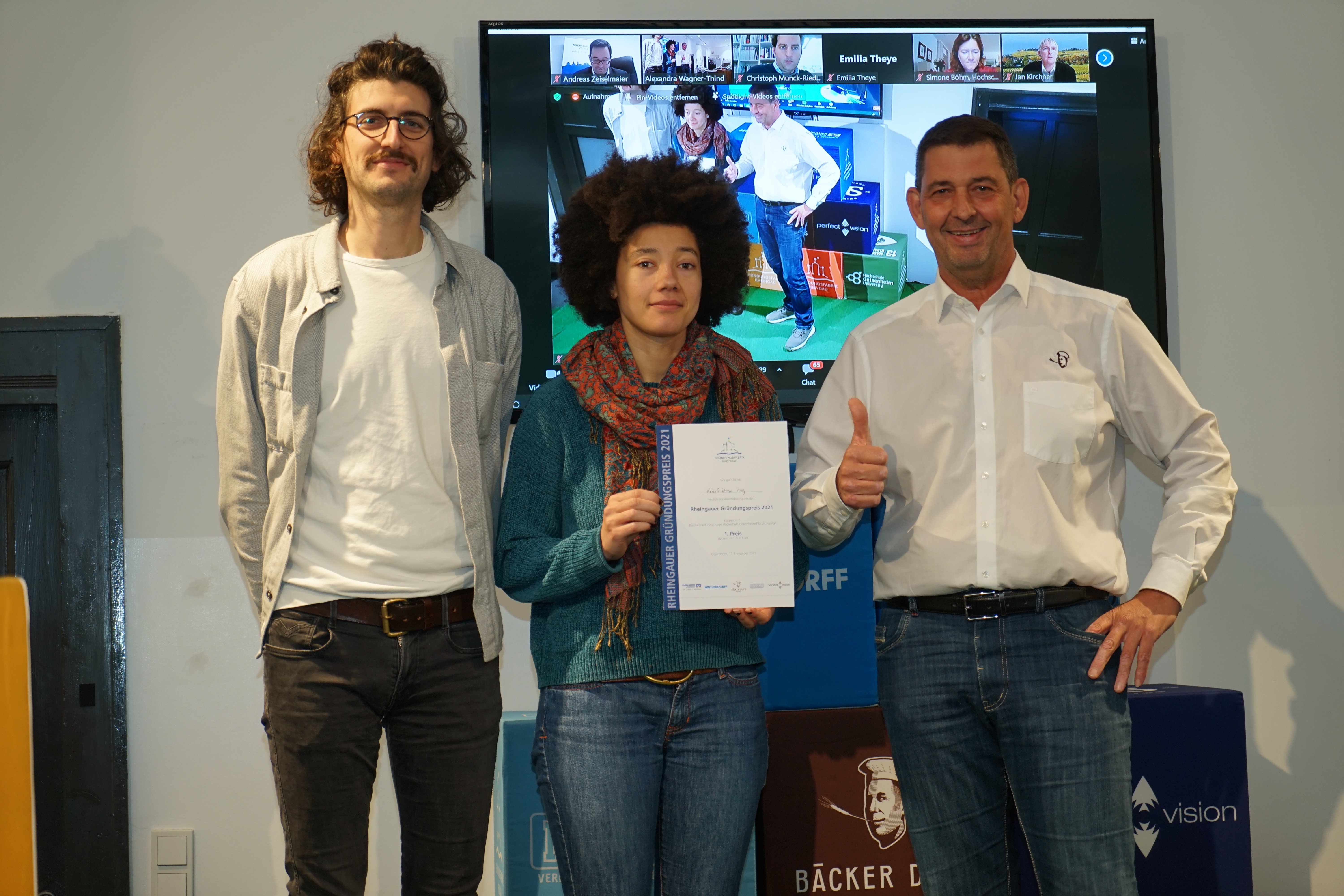 In der dritten Kategorie „Beste Gründung aus dem Rheingau“ gewann das Team Winzza. Joana Sandkühler und Daniel Horne wollten einen neuen Foodtrend im Rheingau schaffen und bieten mit ihrem mobilen Foodtruck eine „Winzerpizza“ mit regionaltypischen Produkten an – perfekt passend zum Wein. Ihr Service kann bei Weinevents, Winzerhoffesten oder anderen Veranstaltung der Region eingesetzt werden. Auch die Idee des Weinguts Prana kam bei den online-Zuschauenden gut an und schaffte es damit auf Platz 2. Im Fokus des von Cosima Lindenau und Niklas Eisenacher übernommenen Weinguts in Oestrich-Winkel steht das Thema Nachhaltigkeit durch den Einsatz von pilzwiderstandsfähigen Rebsorten und reduzierte Maschinennutzung sowie die Kombination mit einem Yogastudio im Weingut. Den dritten Platz der Rheingauer Gründungsszene belegte der Erlebnispädagoge Daniel Becker mit Outdoor Stories. Er bietet kleine Abenteuer unter professioneller Anleitung für Familien im Rheingau an, bei denen es um das gemeinsame Erleben im Familienverbund geht.