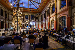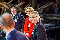 Das Publikum im coronakonform bis auf den letzten Platz besetzten Sauriersaal im Berliner Museum für Naturkunde lauscht dem Vortrag von Bundesministerin Steffi Lemke © Thomas Rosenthal
