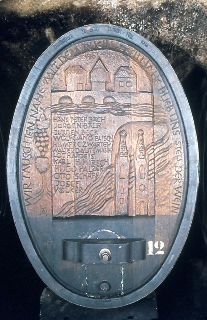 Dieser Fassboden wurde von Geisenheimer Absolventen gestiftet, die einst ein Weinbaustudium in Bad Kreuznach begannen. Richtig gelesen ! – damals gab es schon einmal den Versuch in Rheinland-Pfalz ein Weinbaustudium zu etablieren. Die Einsicht des ganzen Semesters war es, nach kurzer Zeit komplett nach Geisenheim zu wechseln…. es hat ihnen wohl nicht geschadet.