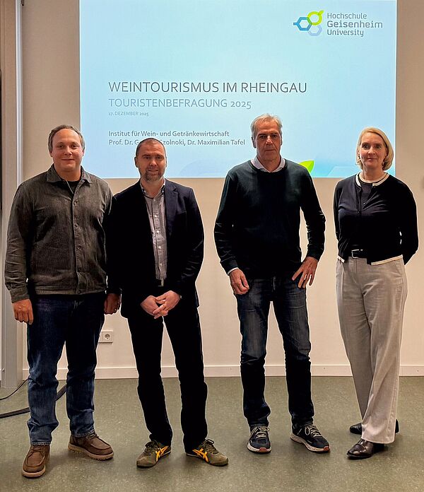 Prof. Dr. Gergely Szolnoki ordnete die Ergebnisse zunächst international ein und stellte zentrale Erkenntnisse des Global Wine Tourism Report 2025 vor, bevor er gemeinsam mit Dr. Maximilian Tafel die spezifischen Resultate für den Rheingau präsentierte.