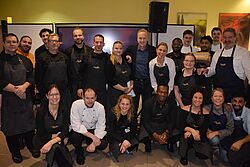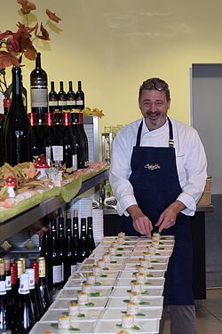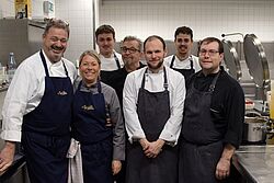 Diese Preise konnten wir nur deshalb halten, so Robert Lönarz, weil viele der beteiligten Winzer ihre Weine vergünstigt oder gar zum Nulltarif zur Verfügung stellten. Rund 8.000 Euro betrug der Gegenwert dieser Spitzenweine. Verkostet wurden sie aus Gläsern der Serie „Josephine II" der JosephinenHütte. Das mundgeblasene Designerglas mit dem charakteristischen Knick im Glas kostet pro Stück 64 Euro. ,,Wir mussten dafür nur die Versicherung für die Gläser zahlen", erläuterte Lönarz. Stellten die Gläser für die mehr als 100 Gäste doch einen Gegenwert von 13.500 Euro dar. Wasser stiftete Staatlich Fachinger. Und zuletzt hatte Sebastien Loison der VEG Sonderkonditionen eingeräumt. Mit seinem 20-köpfigen Küchen- und Serviceteam sorgte er dafür, dass seine kulinarischen Kreationen in der stimmungsvoll zu einem Festsaal umdekorierten Mensa bei den Gästen – im doppelten Wortsinn – bestens ankamen.