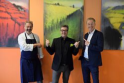 Robert Lönarz und seine Kolleginnen aus dem VEG-Vorstand – namentlich nannte er Ruth Lehnart, Jasmin Kettenbach, Heike Fuhrmann und Karina Klotz – wussten, dass sie sich ein ambitioniertes Programm ausgedacht haben. Die Vorgabe, ,,entspannt mit einem strengen Zeitplan" zu arbeiten, schien fast wie die Quadratur des Kreises. Doch dank des guten Zusammenspiels von Michael Apitz, der zu jedem seiner Bilder eine kurze Einführung gab und seine Sicht der Weine vorstellte, den Probenleitern Monika Christmann und Otmar Löhnertz, Martin Seidler sowie Sebastien Loisons Küchenteam konnte der Zeitplan eingehalten werden. Gestartet um 15:13 Uhr – die 13 war auch hier dem Leitmotiv 13 geschuldet - ging es schon auf Mitternacht zu, als die Servicekräfte ihre letzten Weine ausschenkten und die letzten Speisen auftrugen. Mit stehenden Ovationen wurden sie und die Köche gefeiert. Eine schöne Geste auch, dass mit dem 46-fachen Fußball-Nationalspieler Garsten Ramelow ein prominenter Gast sich nicht zu schade war, für das Loison-Team um TrinkgeldSpenden zu werben. Ein Ansinnen, dem die Gäste freigiebig folgten.