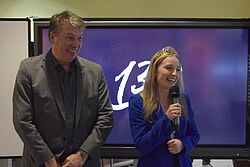 Persönliche Verbindungen waren es auch, die dem Event königlichen Glanz verliehen. Die frisch gekürte Deutsche Weinkönigin Anna Zenz ist wie Robert Lönarz an der Mosel zuhause. Zufälligerweise sind sie sogar in der gleichen Gemeinde Ediger-Eller aufgewachsen. Die charmante Weinmajestät zeigte sich in ihrem Grußwort gespannt auf die bevorstehende Genussreise. ,,Alle 13 deutschen Anbaugebiete in einer Weinprobe, teilweise sogar von den Winzern selbst kommentiert". Sie habe noch nie etwas Vergleichbares erlebt. Dass sie damit nicht allein war, bestätigte ihr Robert Lönarz gerne. ,,Du bist sicherlich nicht die Einzige". Auch er habe – wie wahrscheinlich auch keiner der übrigen erwartungsfrohen Gäste – eine so umfassende Weinprobe, verbunden mit Kunst und Kulinarik erlebt. Unter den Gästen war auch die erst seit Juli amtierende Geschäftsführerin des Deutschen Weininstituts und zugleich Vorständin des Deutschen Weinfonds (DWF) Melanie Broye-Engelkes. Den hohen Stellenwert, den die „WeinSoiree der Extraklasse" auch hochschulintern genoss, spiegelte sich in Person der beiden Probenleiter wider. Mit den Professoren Dr. Monika Christmann und Dr. Otmar Löhnertz hatte die VEG zwei Ikonen der deutschen Weinwissenschaft für die Moderation aufgeboten. Für die Poetik stand schließlich Martin Seidler, der nach jedem Gang ein – von passender Musik begleitetes – Gedicht aus dem Zyklus „Die 13 Monate" von Erich Kästner vortrug. ,,Die 13 Monate" waren Erich Kästners letzter Gedichtband, erschienen im Jahr 1955. Kästner beschreibt darin die zwölf Monate des Jahres in poetischer Form und fügt einen fiktiven Schaltmonat hinzu, der in sich das Beste aller Jahreszeiten vereint. Es spricht für den Medienprofi, dass er es auch nach mehr als sieben Stunden schaffte, die Zuhörer in seinen Bann zu schlagen.