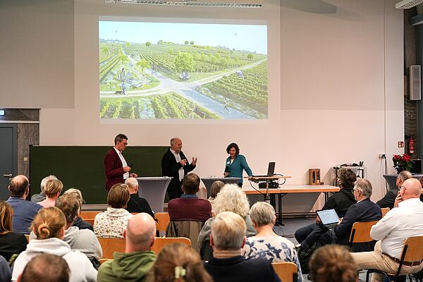 Durch das Programm führte Dr. Verena Rossow vom Institut für sozial-ökologische Forschung (ISOE), das Projektpartner bei GeisTreich ist. Prof. Klaus Werk, Vorsitzender der Bürgerstiftung, und Prof. Dr. Hans Reiner Schultz, Präsident der Hochschule Geisenheim, stimmten auf die thematischen Schwerpunkte ein. In einem gemeinsamen Vortrag hoben die Professor:innen Manfred Stoll (Weinbau), Ilona Leyer (Ökologie) und Eckhard Jedicke (Kulturlandschaft) hervor, dass der gegenwärtige Wandel im Weinbau auch Chancen mit sich bringe: Durch die freigewordenen Flächen entstünden Möglichkeiten, die Landschaft als Produktions-, Erholungs- und Lebensraum weiterzuentwickeln und den Herausforderungen der Klimakrise besser gerecht zu werden. Das Animationsvideo ‚Landschaft ist veränderbar‘ (abrufbar u. a. auf YouTube) veranschaulicht diese Vision beispielhaft: eine Weinbergsflur, die sich von einer monotonen Landschaft zu einem abwechslungsreichen und attraktiven Raum entwickelt, der neben der Traubenproduktion vielfältige Funktionen erfüllt.