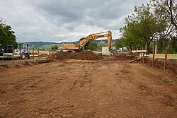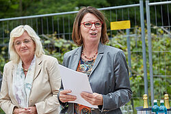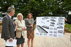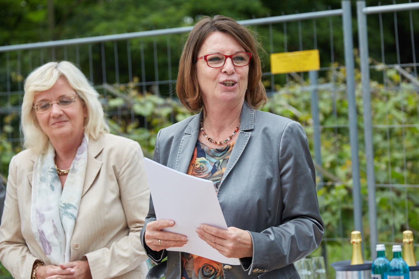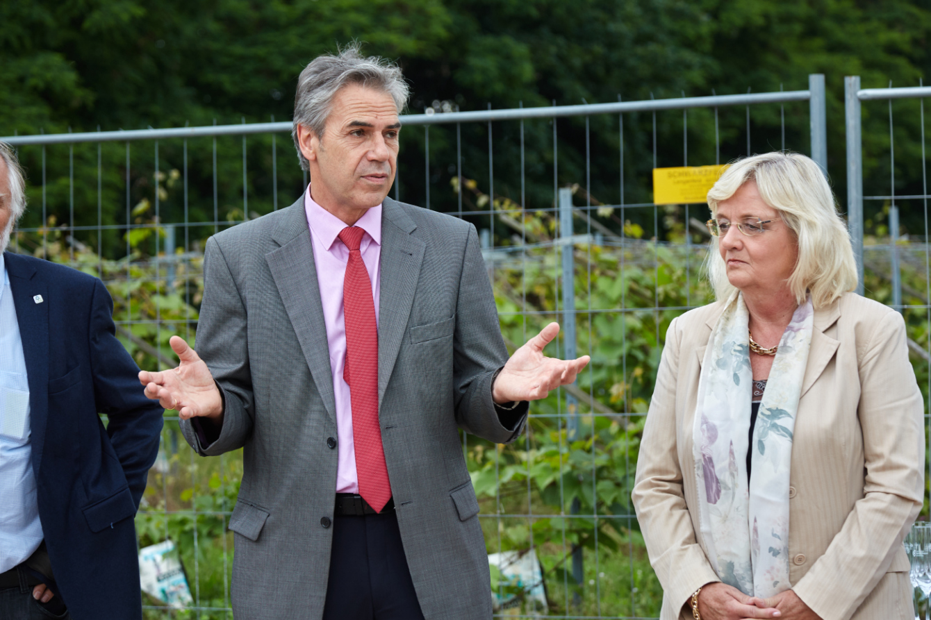 Prominenter Besuch auf der Baustelle des künftigen Studierendenwohnheims im Eibinger Weg: Priska Hinz, Hessische Staatsministerin für Umwelt, Klimaschutz, Landwirtschaft und Verbraucherschutz, besichtigte zusammen mit Hochschul-Präsident Prof. Dr. Hans Reiner Schultz, Geisenheims Bürgermeister Frank Kilian und Konrad Zündorf, Geschäftsführer des Studentenwerks Frankfurt am Main, die Baustelle. Hinz überreiche dabei auch den Förderbescheid des Landes Hessen.