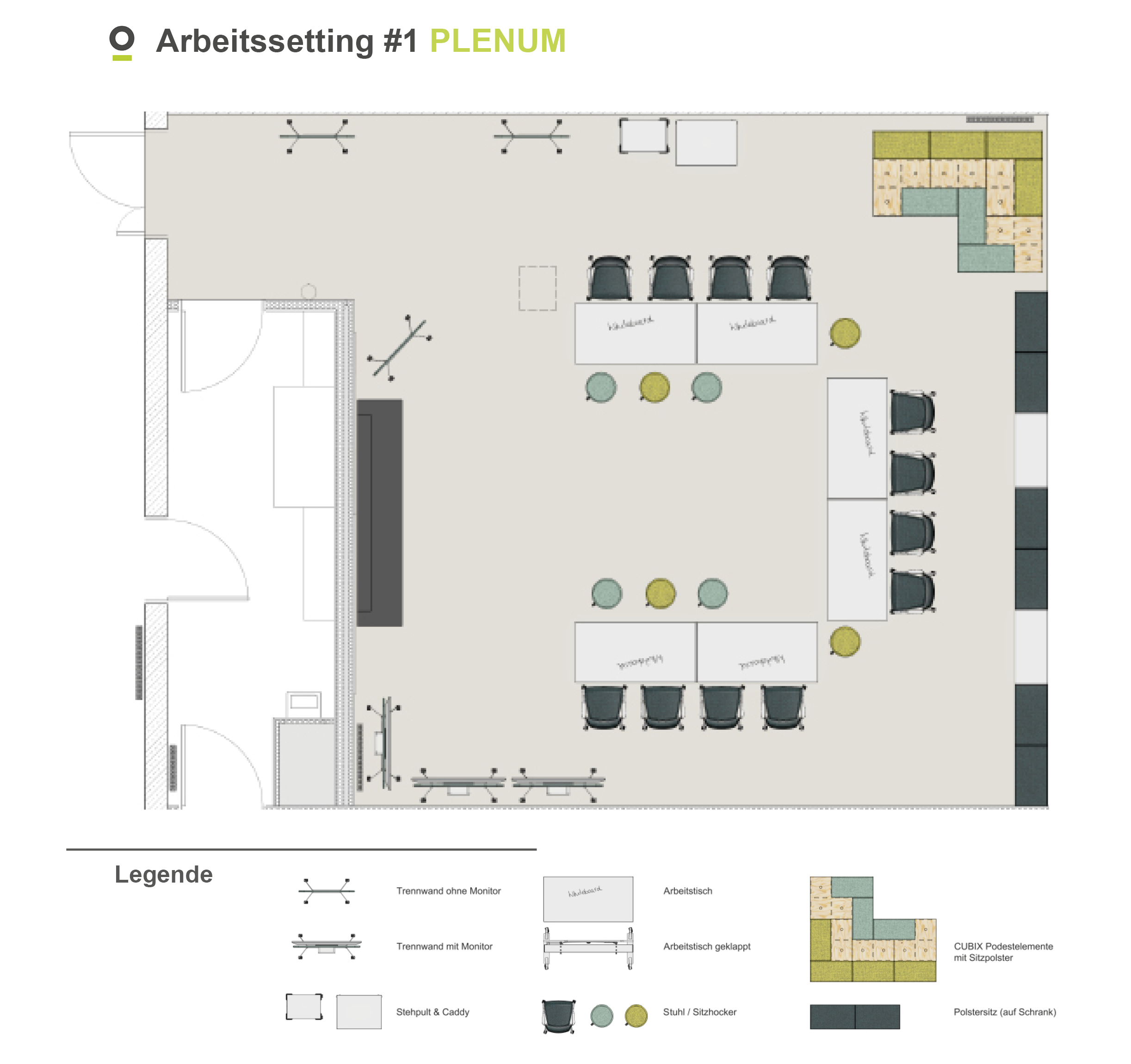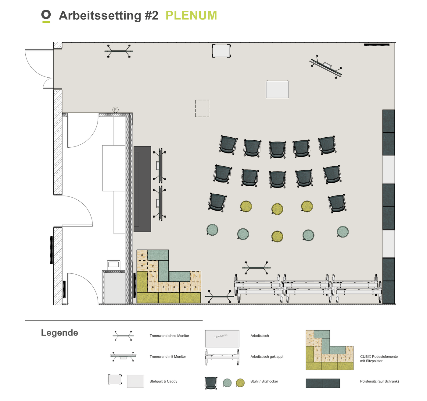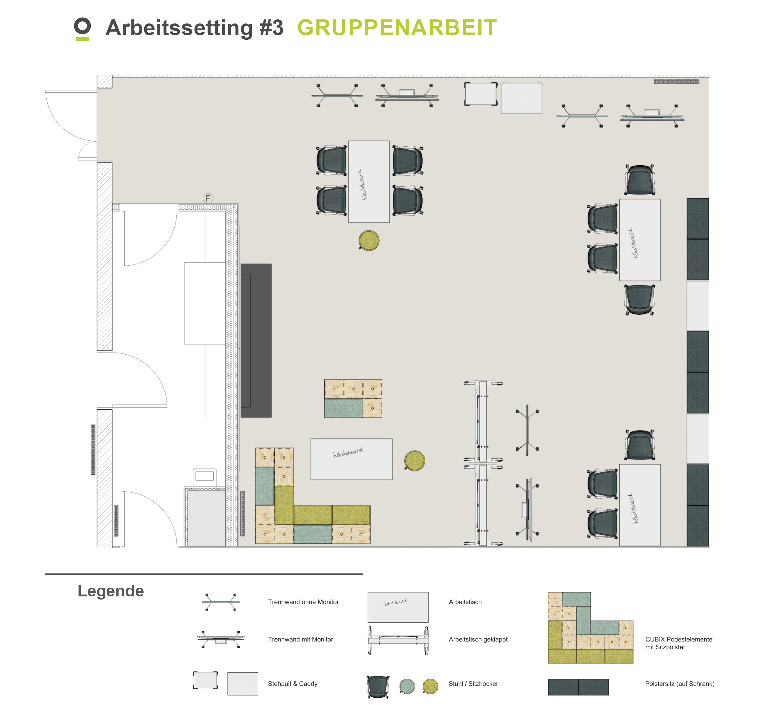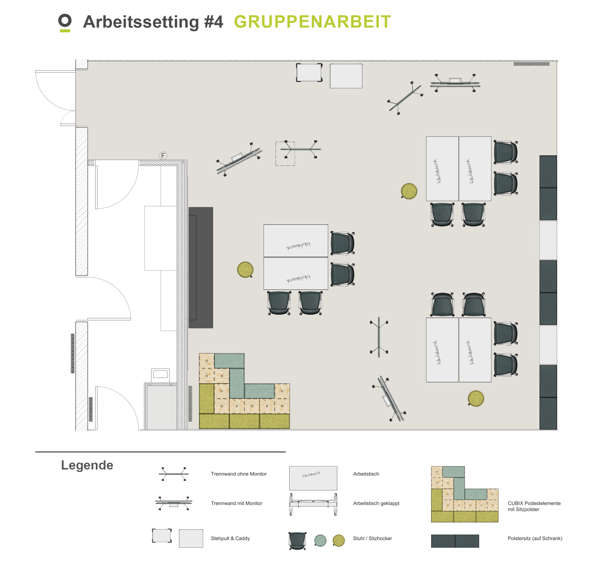 Zur Orientierung wurden vier exemplarische Settings visualisiert: zwei für Plenumsarbeit, zwei für Kleingruppen.