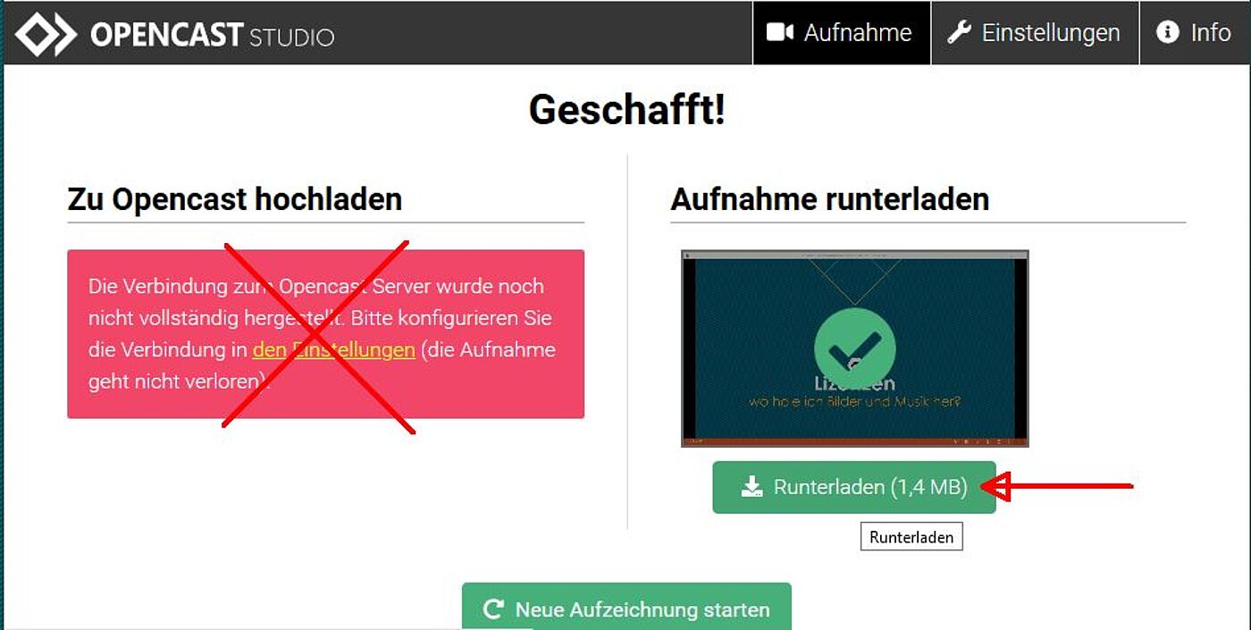 5. Sind Sie mit der Aufzeichnung fertig können Sie diese noch mal prüfen. Der Browser lädt dazu die Vorschau hoch. Dieser Vorgang kann bei einer langen Aufzeichnung einige Minuten dauern. Prüfen Sie die Video- und Tonqualität! Anschließend wird Ihnen die Option angeboten, die erstellte mp4-Datei herunterzuladen (Download-Button, siehe Screenshot) oder die Aufzeichnung „Verwerfen und neu aufzeichnen".