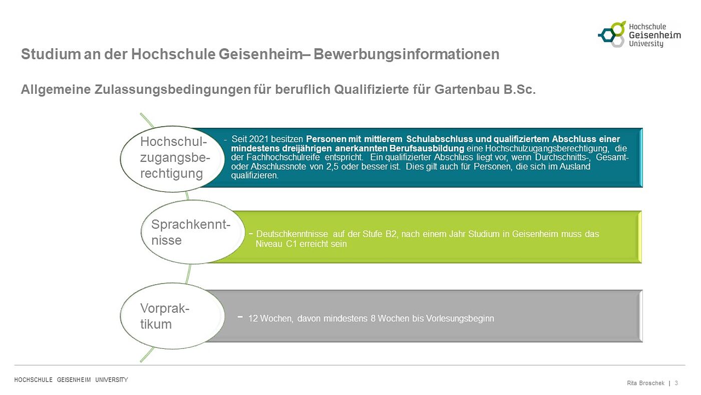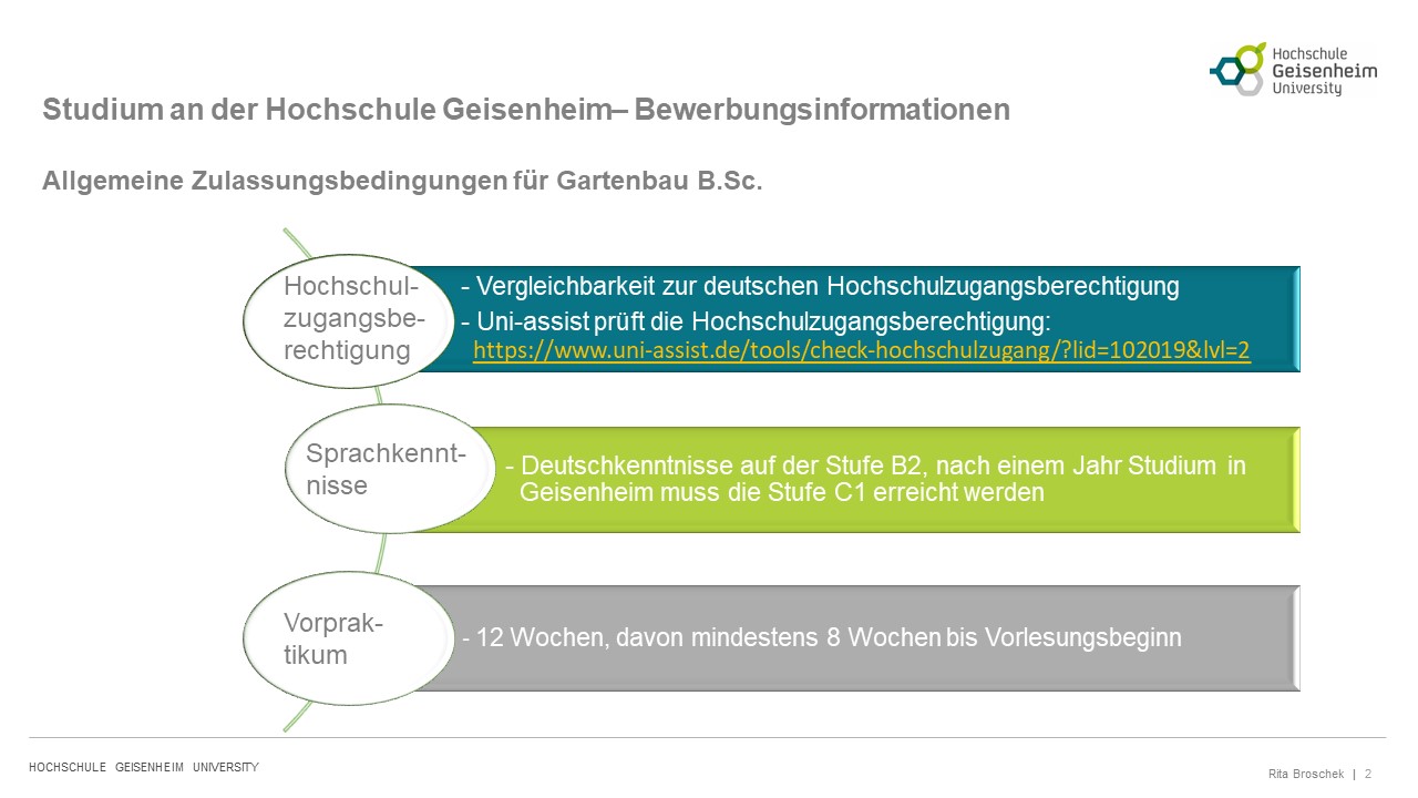 - Deutschkenntnisse auf der Stufe B2, nach einem Jahr Studium in Geisenheim muss die Stufe C1 erreicht werden