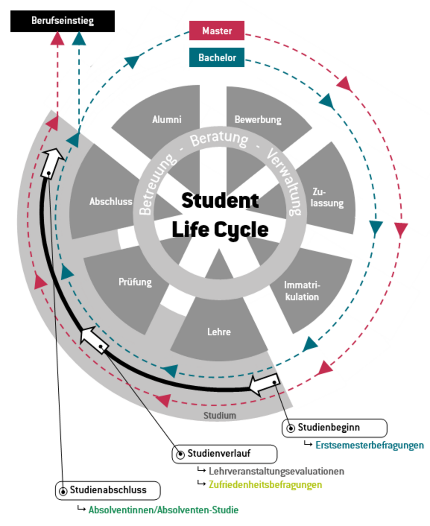 Dazu werden im Laufe des "Student Life Cycle (SLC)" verschiedene standardisierte Befragungen der Studentinnen und Studenten vorgenommen. Je nach Evaluationsanliegen kommen ergänzend unterschiedliche Methoden zum Einsatz.