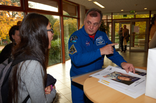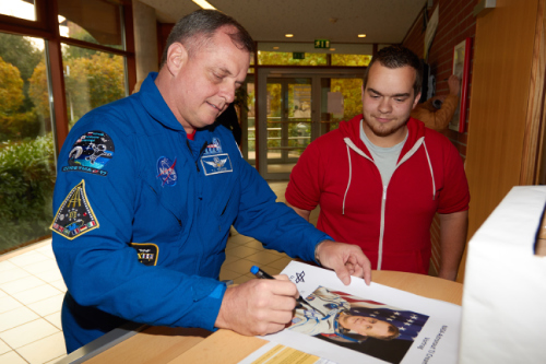 Der Astronaut flog mit einer internationalen Crew im Rahmen der ISS-Expeditionen 22/23 für sechs Monate zur Internationalen Raumstation. Packend schilderte er seine Erfahrungen im Weltall, beeindruckend seine Schilderungen der Schwerelosigkeit.