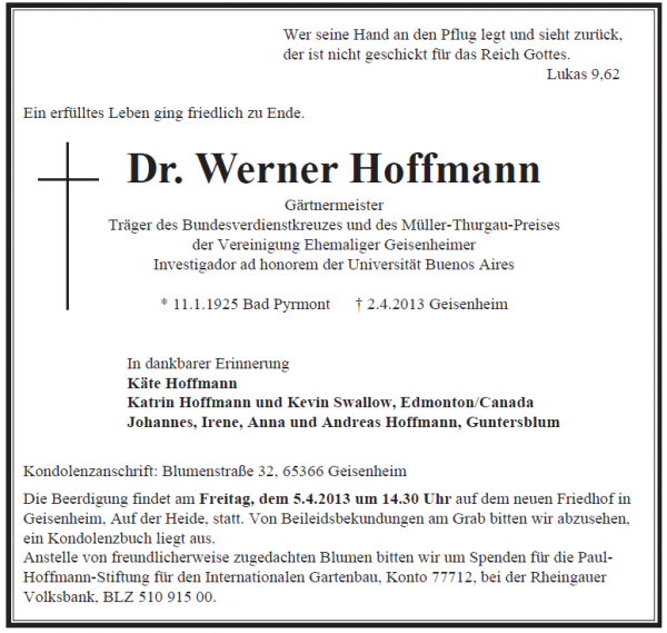“Das Gärtnerdasein ist ein Abenteuer”, hatte Dr. Werner Hoffmann schon vor einigen Jahren resümiert, als er den Müller-Thurgau-Preis von der
