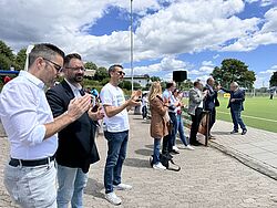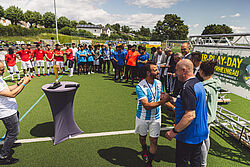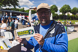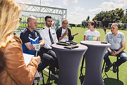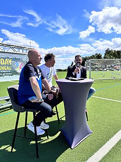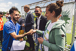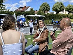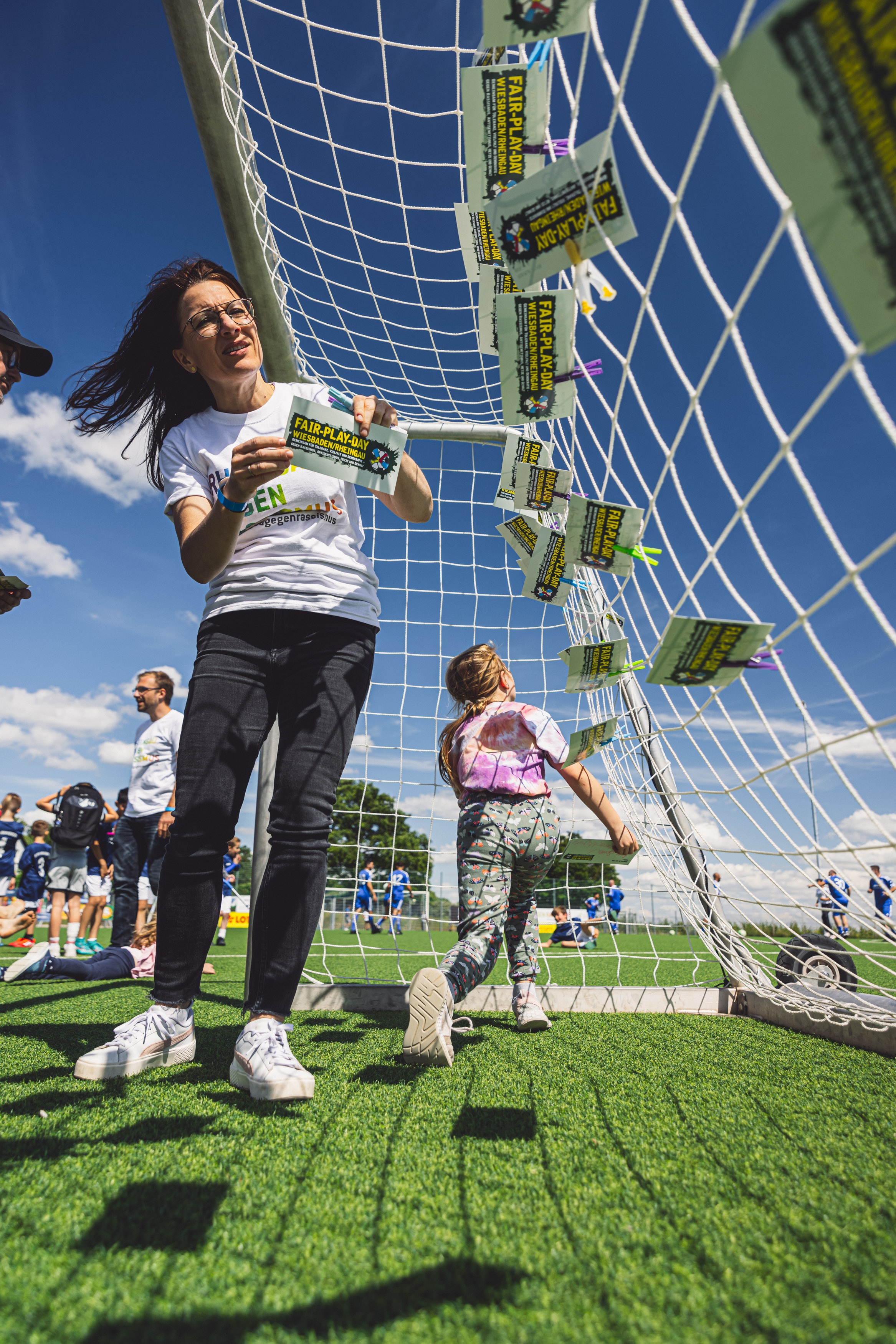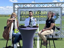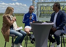 Gelebte Integration stand dann auch im Laufe des Tages im Fokus des Programms. Nach einem Fußballturnier mit insgesamt fünf Integrationsmannschaften, folgte ein Informations- und Mitmachnachmittag mit interessanten Impuls-Interviews zu den drei Themenbereichen „Regeln und Miteinander“, „Integration und Vielfalt“, sowie „Demokratie leben und mitnehmen“. Selbst aktiv werden konnten die Gäste beim Schiri- und Fußballregeltraining, einer Session zum Tricks-Lernen durch und mit den Jugendtrainern des SV Johannisberg, sowie bei der Aktion „Sichtbar sein“, bei der die Anwesenden für sich selbst die Frage beantworten konnten, was Fair Play für Sie selbst bedeutet. Moderiert wurden dieser Teil der Veranstaltung durch Sonja Pahl, Leiterin der Sportredaktion beim Radiosender HITRADIO FFH.