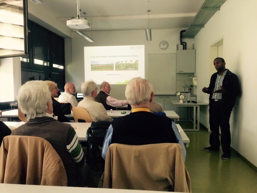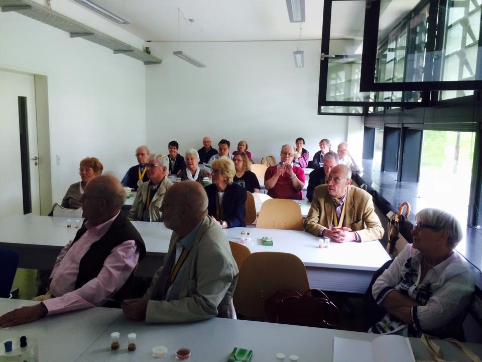 Oberreimerin Donate Krappe führte die Gruppe von 25 Weinreimern an. Campus Manager und Alumni-Präsident Robert Lönarz begrüßte die Gäste mit einem Sekt-Empfang am alten Weinfass. Anschließend führten die Wissenschaftler Dr. Selim und Melanie Dahlmann die interessierten Besucher in die Welt der Kirschessigfliege, sowie in den Klimafeldversuch FACE ein. Die nachhaltige Begeisterung war in den Augen abzulesen. Eine abschließende Weinprobe mit Weinen des Weinguts der Hochschule rundete die Exkursion ab.