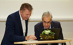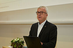 Bericht des Hochschulpräsidenten über Baufortschritt: Prof. Dr. Hans Reiner Schultz, Präsident der Hochschule Geisenheim, informierte die Teilnehmer über den aktuellen Stand der Bauprojekte an der Hochschule. Insbesondere ging er auf die Erweiterungen ein, die nicht nur die Infrastruktur verbessern, sondern auch die Forschungs- und Lernmöglichkeiten für Studierende und Alumni erweitern sollen.
