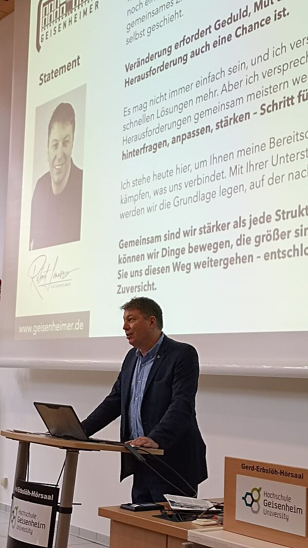 Die ersten Gratulanten waren Hochschulpräsident Prof. Dr. Hans Reiner Schultz und VDL-Präsident Markus Ebel-Waldmann, die Robert Lönarz ihre Anerkennung für sein langjähriges Engagement und seine Führungsstärke aussprachen. Beide betonten die Bedeutung des Alumni-Verbands für die Vernetzung der Absolvent:innen und die Stärkung der Marke „GEISENHEIMER“.