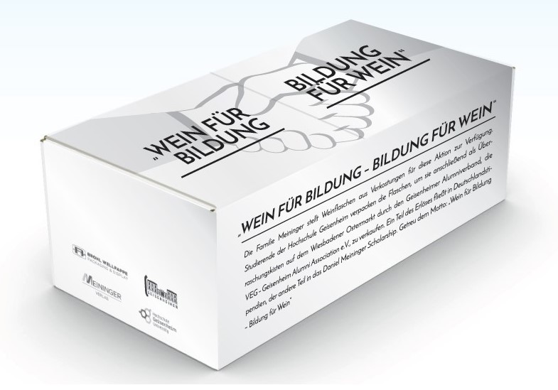 Inzwischen ist sie Kult unter Weinliebhabern in der Region Rheingau-Taunus und Wiesbaden: Die Aktion „Wein für Bildung – Bildung für Wein“, die 2001 gestartet ist. Das besondere an der Verkaufsaktion von jährlich rund 1.000 Überraschungspaketen mit je 6 Flaschen Wein à 25 Euro ist der Verwendungszweck des Verkaufserlöses: Der fließt in Stipendien für Geisenheimer Studierende. Die Aktion führen die Hochschule Geisenheim und ihr Ehemaligenverband, die VEG – Geisenheim Alumni Association e. V., gemeinsam mit verschiedenen Partnern durch.
