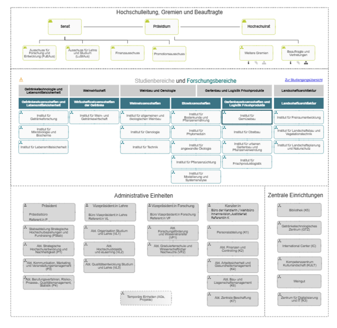 Hier finden Sie das Organigramm der obersten zwei Strukturebenen der Hochschule Geisenheim.